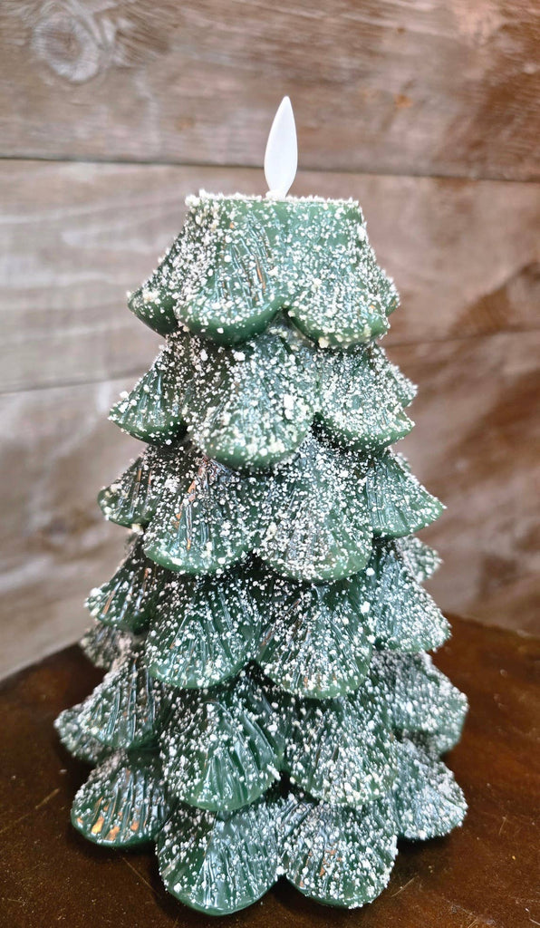 Green Xmas Tree w/ Glitter Moving Flame LED Candle 5x6.5in