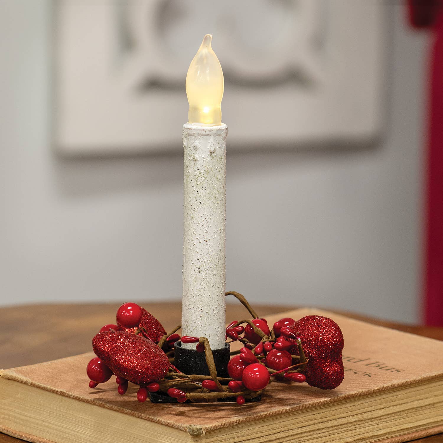 Hearts will fill with joy in the farmhouse this Valentine's season with the addition of charming accents like the Red Glitter Heart & Berries Candle Ring, 2". This cute little candle ring features large foam hearts coated in red glitter emerging from wrapped brown wire stems. Accenting the hearts are deep red pip berries and round shiny berries. The ring measures 2" on the inner diameter and approximately 5" on the outer. This ring is darling with taper candles or holder or makes a cute napkin ring.