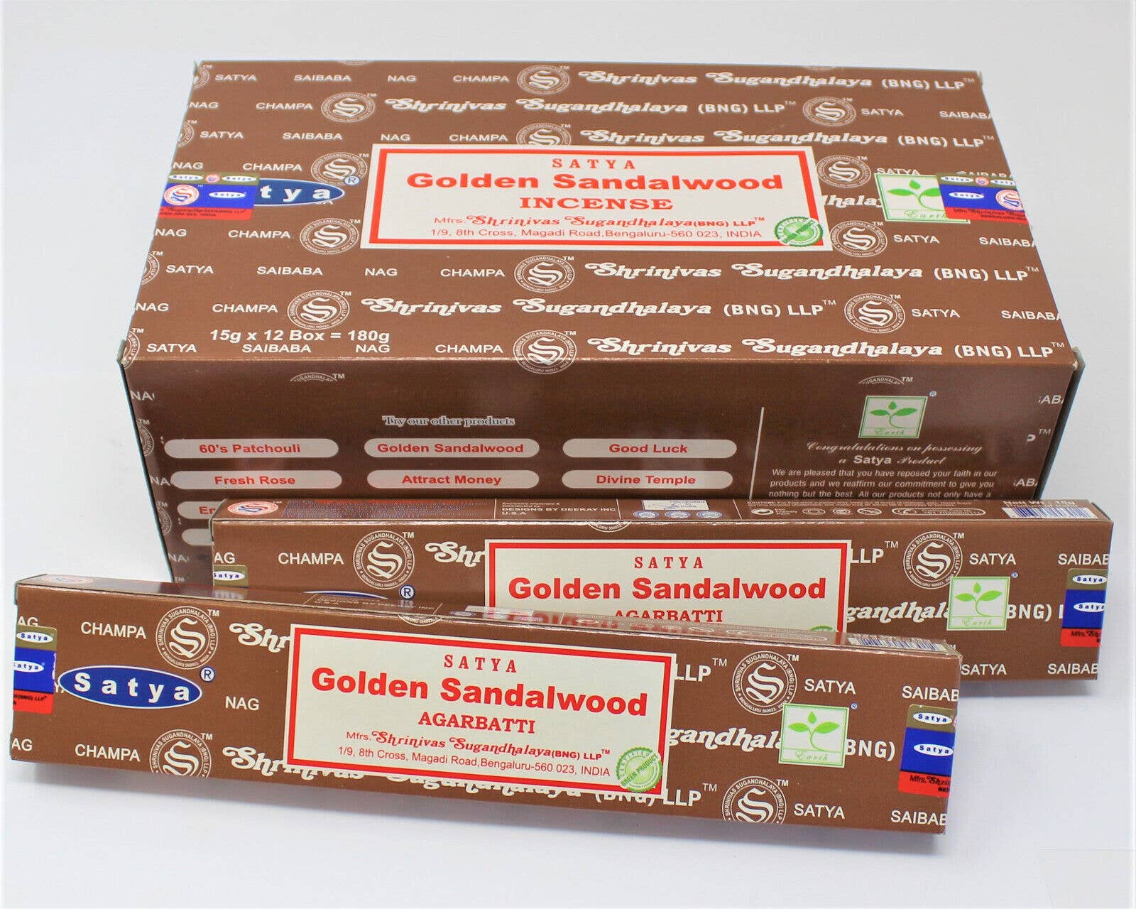 (Satya) Golden Sandalwood Incense Sticks 15 g./Pack  Authentic Nag Champa incense sticks, hand-rolled in Bangalore, India by Satya Sai Baba. Nag Champa Incense is made from mixture of herbs, floral extracts and oils, which are hand rolled onto a bamboo stick. It has become the world's best selling incense, popular for yoga studios, meditation and general burning for relaxation MADE IN INDIA