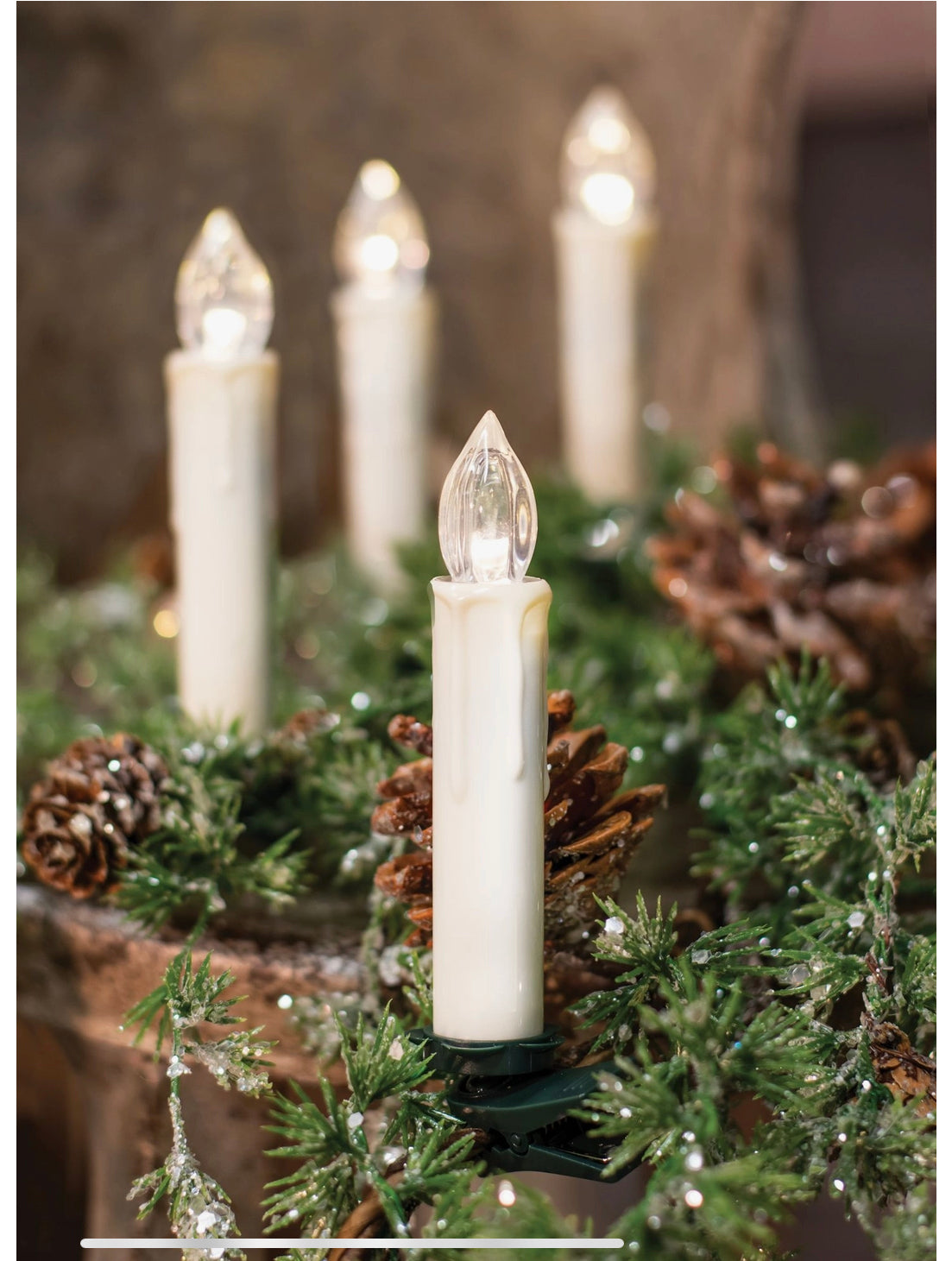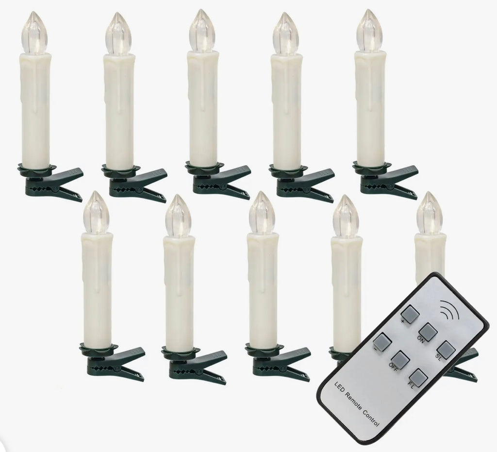 Farmhouse white clip on candles with remote sells as a set of ten clip lights, perfect for lighting up a holiday wreath or tree. The clip tapers have a warm light and include a built-in timer that keeps them lit for 6 hours, then they go off automatically for 18 hours. Purchase includes a remote to easily turn on/off from up to five feet away! Remote runs on 1 CR2025 battery (included). Each taper clip is 4.5" high and requires 1 aaa battery (not included). 10/set.