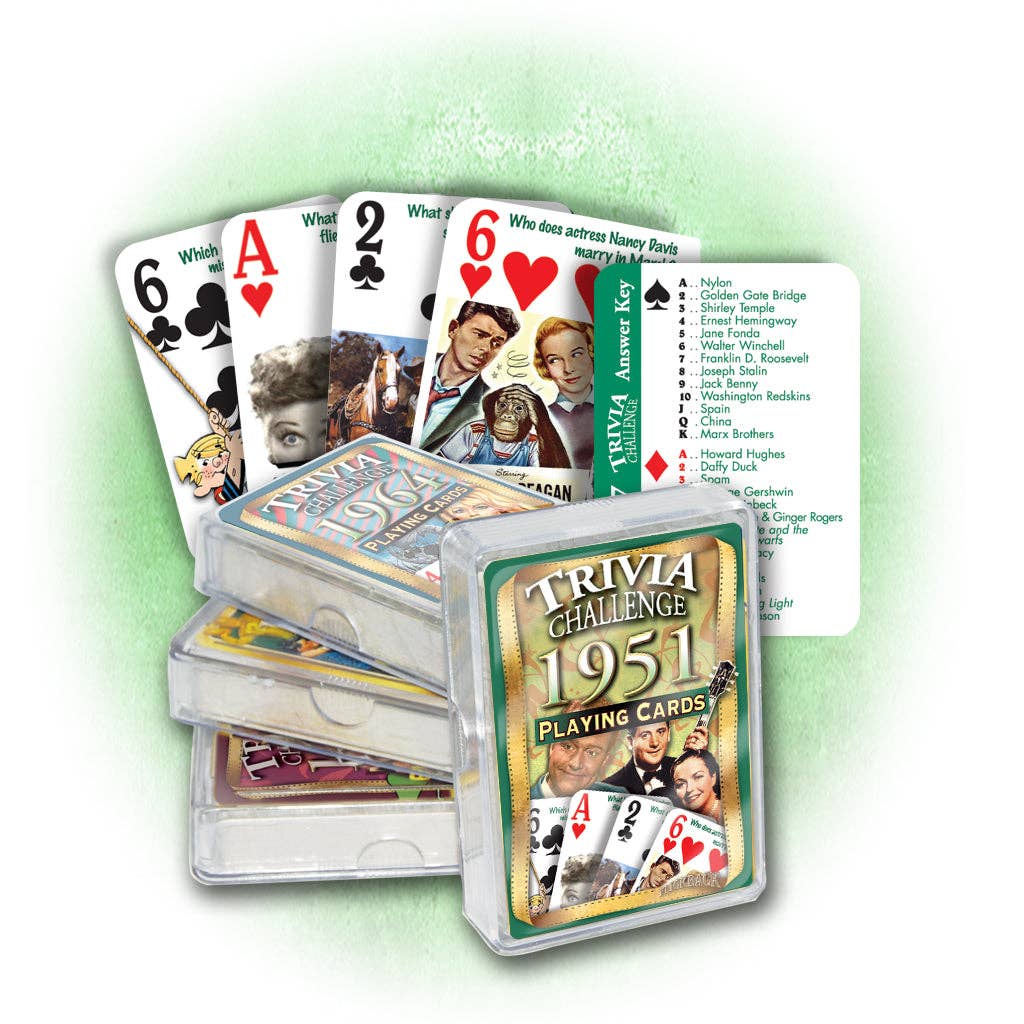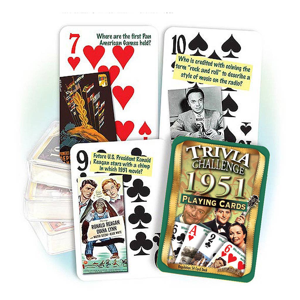 Do you know which radio DJ is credited with coining the term ‘rock and roll’? Or which future U.S. President stars alongside a chimp in “Bedtime for Bonzo”? Test your knowledge or quiz your friends with these 52 colorful illustrated 1951-themed questions about the year's celebrities, sports, events, movies and music. A key card is provided with all the answers, as well as a pair of Jokers loaded with fascinating sports stats. Plus, the cards double as a regulation playing card deck!