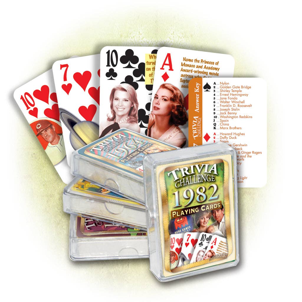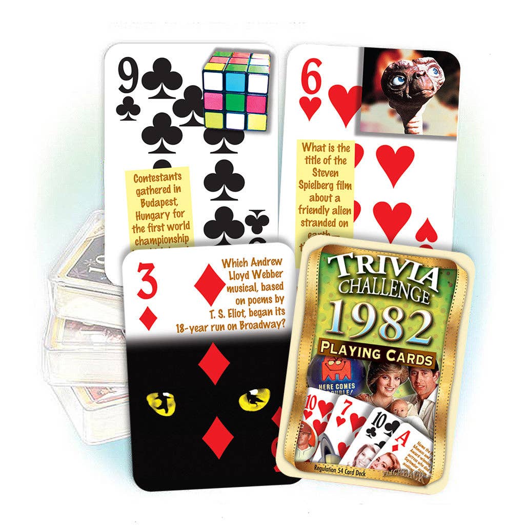 Do you know which Andrew Lloyd Weber musical, based on poems by T.S. Eliot, began its 18-yera Broadway run? Or what disputed south Atlantic islands drove the U.K. and Argentina to war? Test your knowledge or quiz your friends with these 52 colorful illustrated 1982-themed questions about the year's celebrities, sports, events, movies and music. A key card is provided with all the answers, as well as a pair of Jokers loaded with fascinating sports stats. Plus, the cards double as a regulation playing card deck!