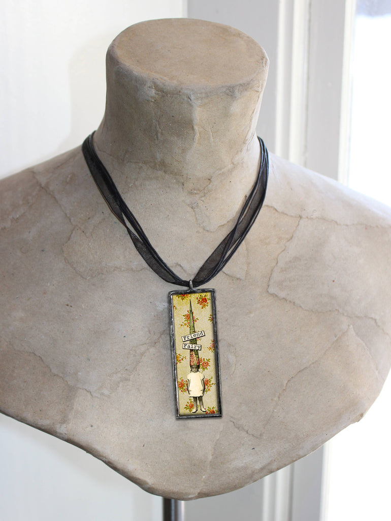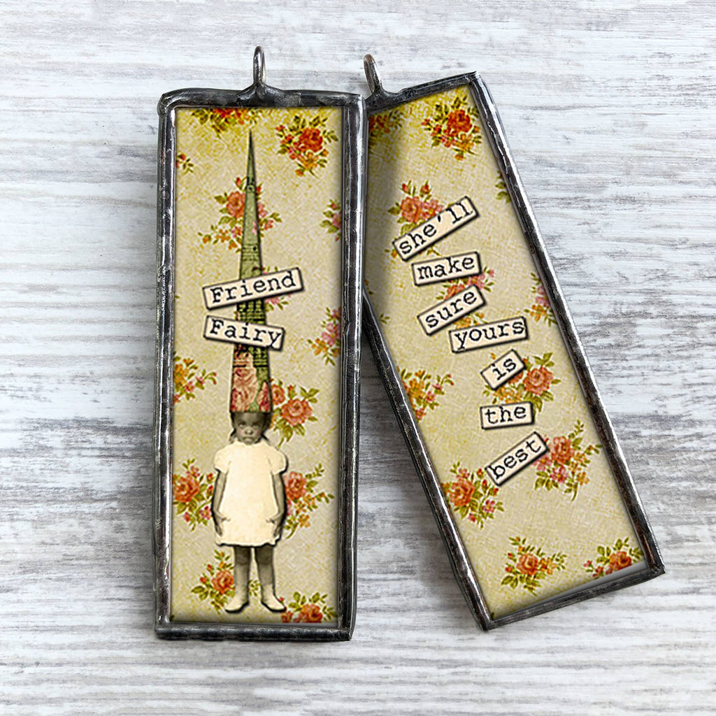 Who needs a little Fairy to hang around and bring some fun and joy? Everyone does! These HANDMADE ornaments and charms are so fun and cute, featuring a themed Fairy under glass with antique metal trim. This version is called: Friend Fairy, and she'll make sure yours is the best!