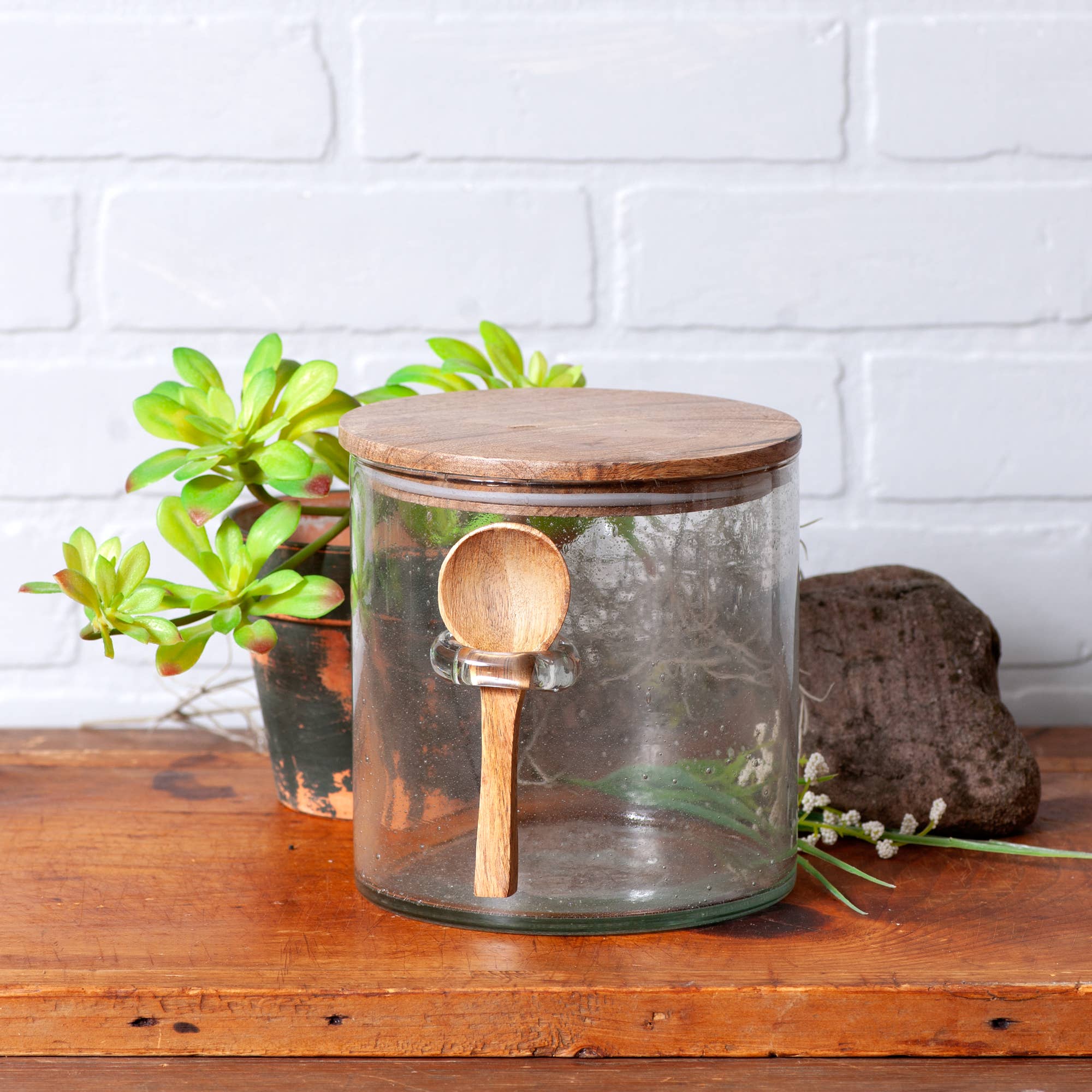 This bubble glass canister combines style and function. Perfect for storing bath salts, tea, cotton balls, or kitchen essentials like flour and sugar, its wide mouth ensures easy access. The wooden lid and spoon add charm, while thick sidewalls provide durability. Ideal for any room, this canister is a practical and stylish storage solution. Item Details: Measures 6.5-Inches high and 6.25-Inches dia; Thick rustic bubble glass with for durability and rustic style; Solid wood spoon and lid; Lid features a silicone seal
