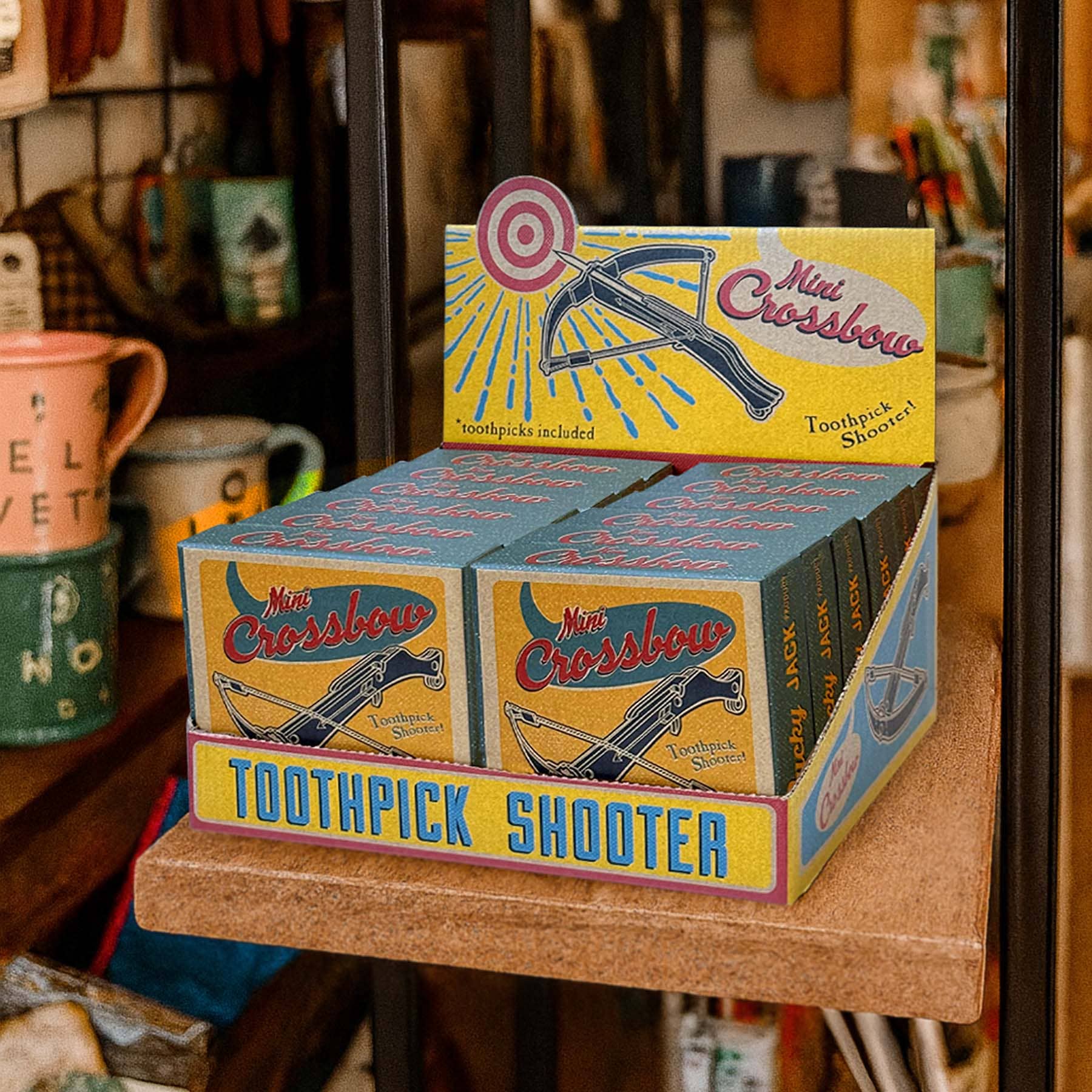 Mini Crossbow Toothpick Launcher – Novelty Desk Gadget. Meet the ultimate conversation starter for guys who love clever gadgets and a good laugh. This mini desktop novelty uses gentle spring action to launch toothpicks a short distance—just enough for a bit of harmless fun. Each set includes 20+ toothpicks and a paper target for lighthearted aim practice at your desk or workbench. Perfect as a men’s gift, stocking stuffer, or quirky display item that’s guaranteed to get people talking ___________________.