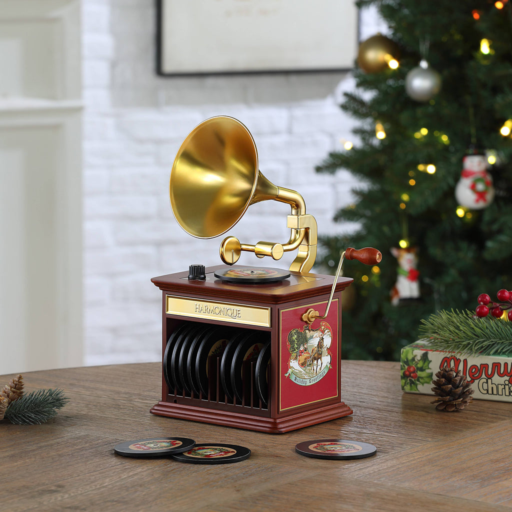 Step into the past with the captivating Nostalgic Gramophone by Mr. Christmas. Standing 12" tall, this delightful piece features a beautifully crafted turntable where you can place mini vinyl records to select your favorite holiday songs. With a collection of 12 instrumental Christmas melodies, you can immerse yourself in the festive spirit. The gramophone boasts a vintage-style knob for easy power and volume control. Battery-operated (4 x AA, not included) for your convenience, this holiday treasure looks great on the mantel, table, or anywhere that needs a festive touch. Experience the magic of Christmas in the most delightful way with the Nostalgic Gramophone. 90th anniversary collection Nostalgic record playing Gramophone Place mini vinyl records on turntable to play a song 12 instrumental Christmas songs on records Knob to control power and volume All songs will be played until record is changed 8.2" wide 6.5" deep x 12" tall Battery operated (4 x AA, not included)