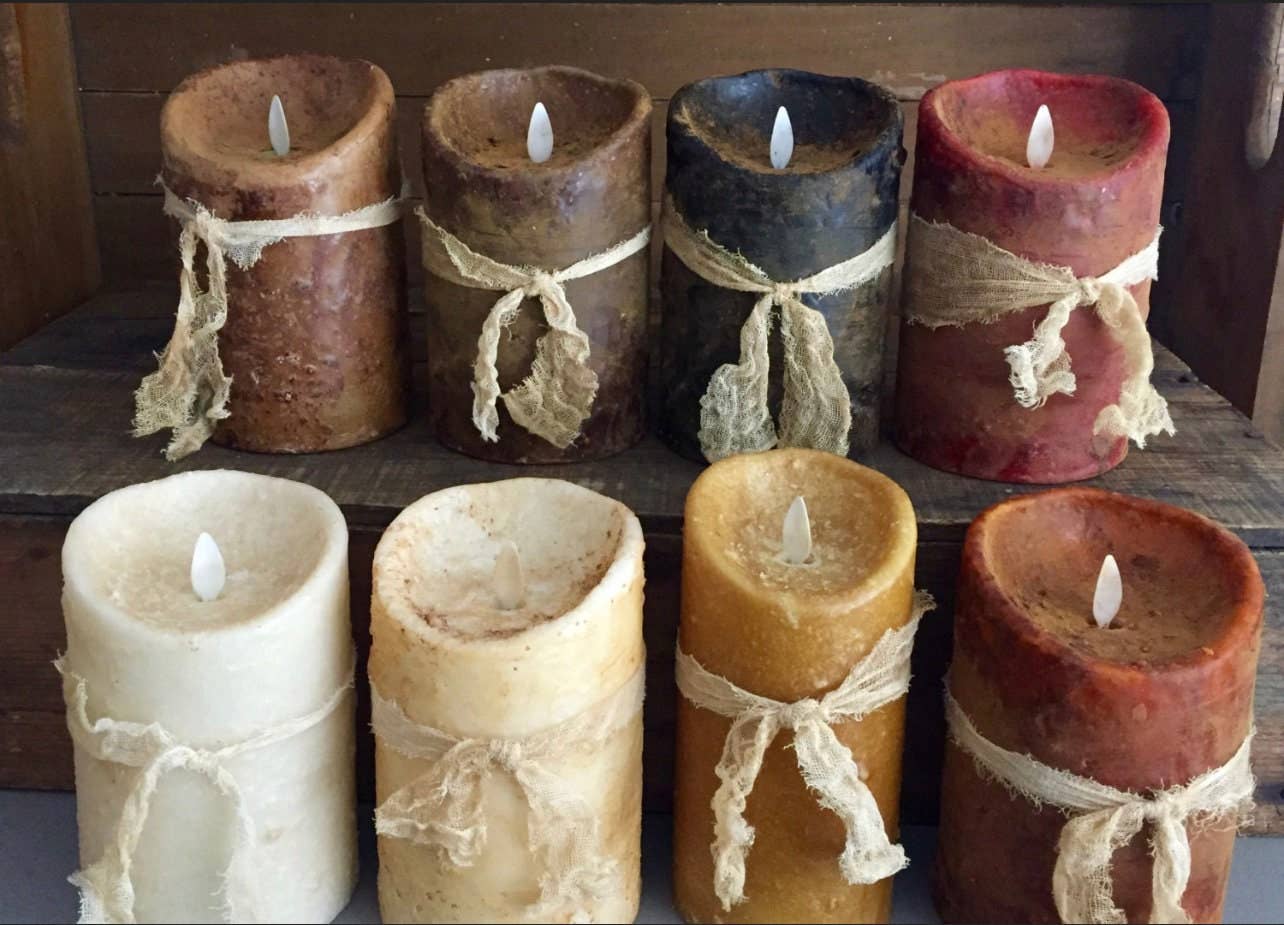 8” Battery Operated Timer Glow Taper, Raggedy Junction. Each Battery operated candle takes (2) AAA battery not included. The bottom screws off and put the batteries in. Tighten the bottom back on for the candle to light up. It flickers like a real candle. For the timer, say you turn the candle on at 6pm, it will stay on until midnight and then go off and turn back on at 6pm the next day. So whatever time you turn the candle on, it stays on for 6 hours and goes off for 18. Materials: Wax,Beeswax,Cinnmon,Glitter