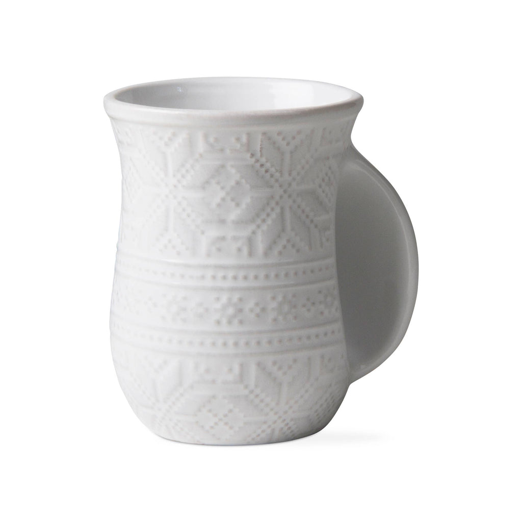 Keep hands toasty with this handwarmer mug. Hands are nestled into the glove-like shape, keeping you cozy as you sip. Reactive glazes are layered over wax resist designs for added texture and depth. Dimension: 5 inch h x 3.75 Inch dia. Material: stoneware.