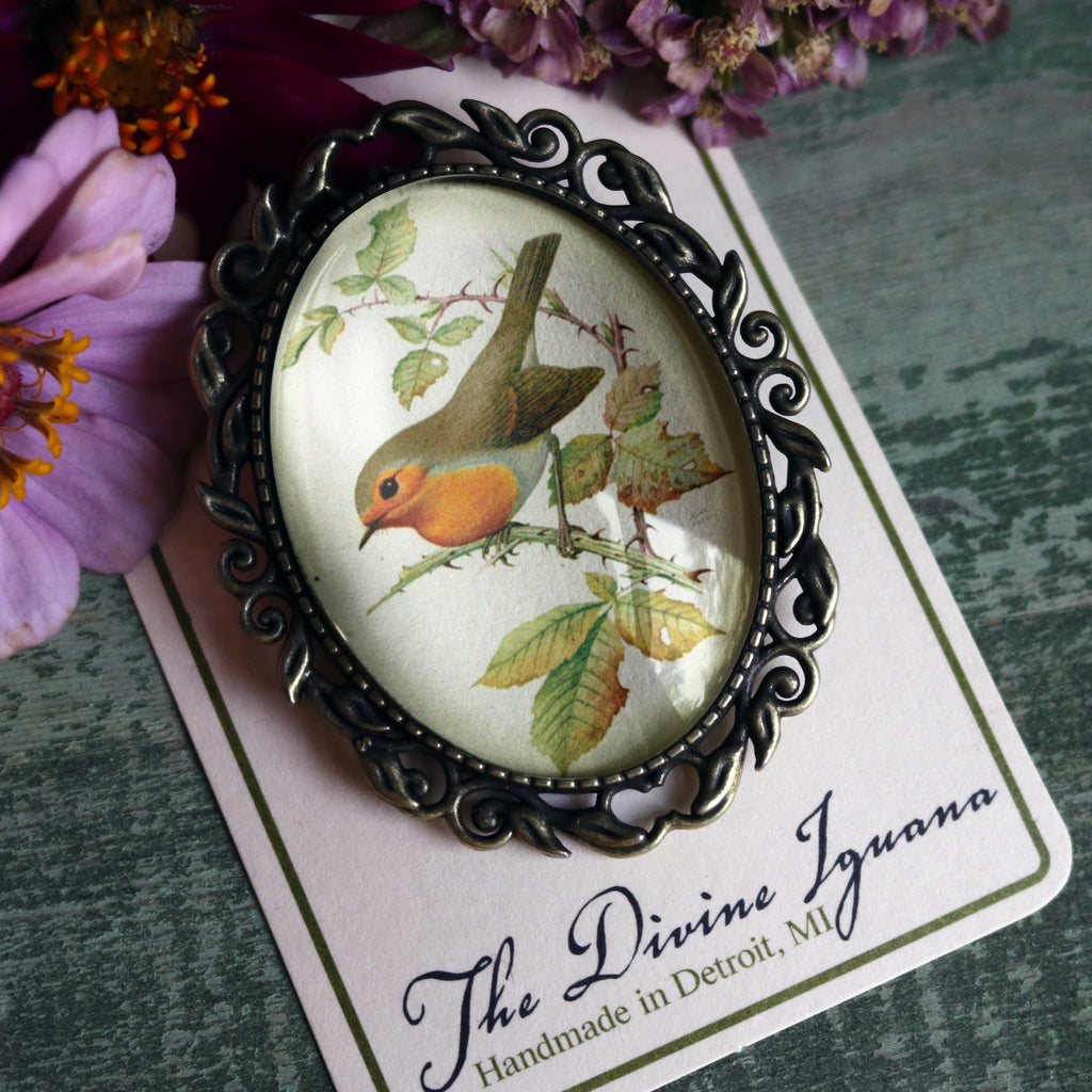 The Divine Iguana - Robin Cottagecore Large Oval Brooch