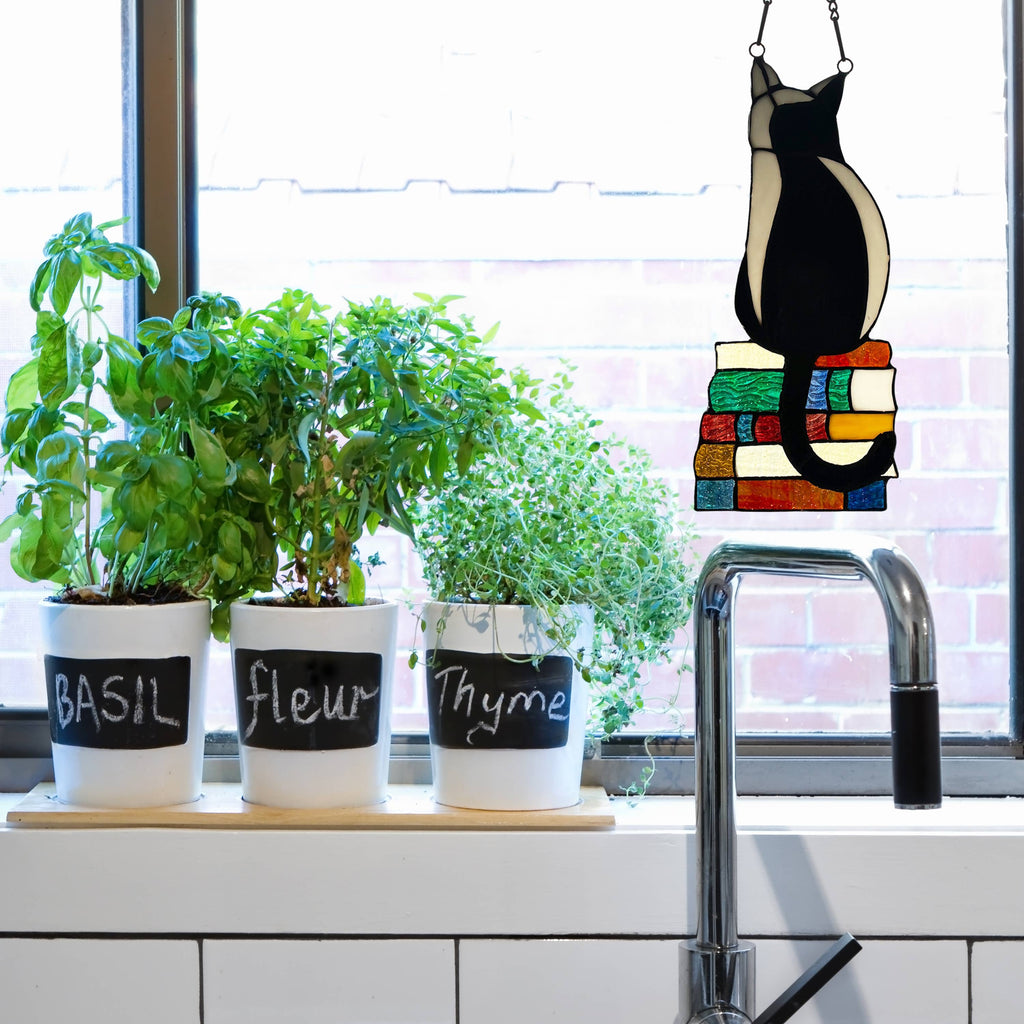 River of Goods - 12.5”H Kate Black Library Cat Stained Glass Window Panel