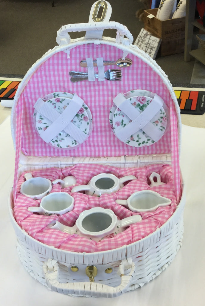 LG PR’L TEA SET / WHITE BASKET , PINK CHINA