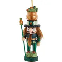 Hollywood™ Irish Nutcracker Ornament. Size: 6 inches. Hollywood™ Nutcrackers is a whimsical collection of nutcrackers and nutcracker ornaments created exclusively for Kurt S. Adler, Inc. and features an assortment of designs that put a unique, vibrant, memorable twist on traditional nutcrackers. This nutcracker ornament features a black and green glittered color scheme with a gold pot o' gold hat filled with gold coins and green glittered shamrocks