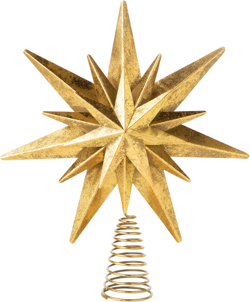Foiled Metal 3D star tree topper, antique gold, one-sided. The dimensions are approximately 10in