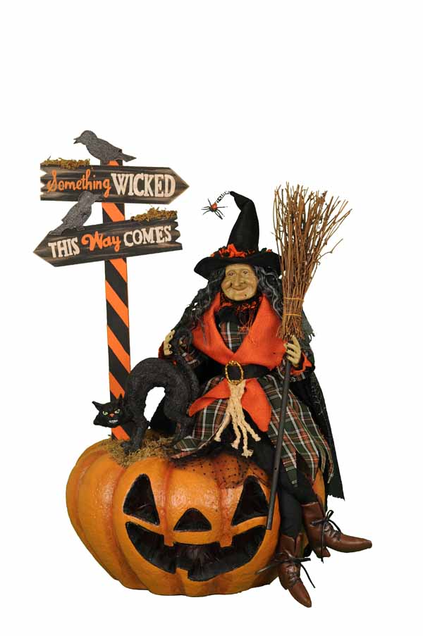 The NEW Karen Didion Agnes Witch is a fun and spooky addition to Karen’s Spooktacular collectibles. The quality is unmatched with this decorative piece’s superior fiber optic design which outlines the jack-o-lantern’s grin with orange lighting. Agnes’s ornate fabric, detailed accessories, and folky design will be sure to add add a smile to your guests’ faces when viewing your Halloween display!