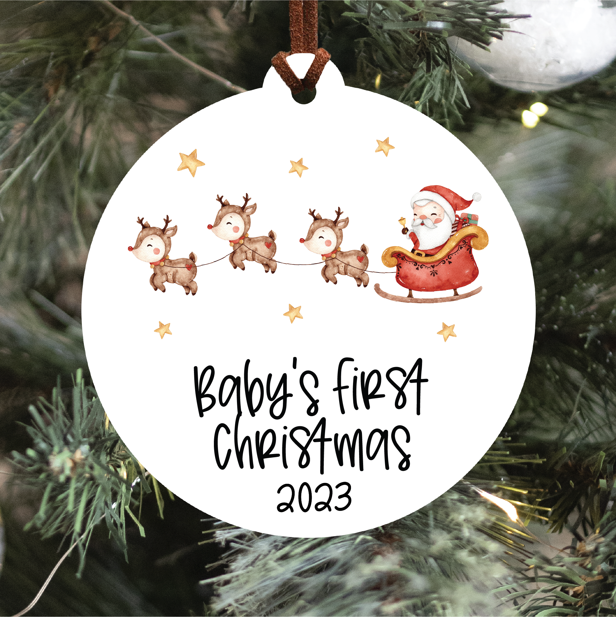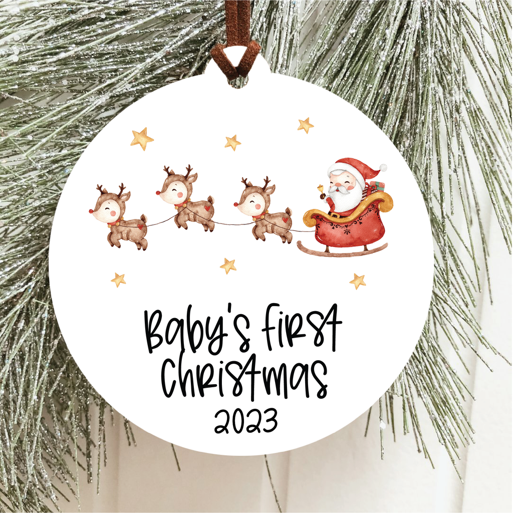 Baby's First Christmas 2023 Ornament with Santa and his reindeer fleet. This ornament is available in multiple variations. Check out our shop page to see the rest!