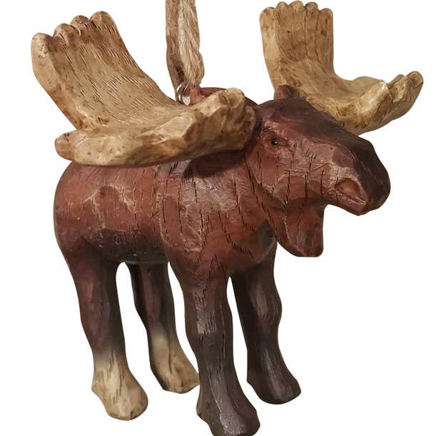 Add a touch of rustic charm to your holiday decor with the Bert Anderson Handmade Resin Antique Moose Ornament - a delightful representation of an antique moose head mount. This ornament is expertly crafted by skilled artisans using high-quality resin, and features intricate details that make it look like an actual antique moose mount. Measuring at approximately 3.75 inches tall, this ornament is the perfect size to add to your Christmas tree, wreath or any other festive display. Whether you're a collector of vintage items, a fan of the outdoors, or simply appreciate the beauty of handmade crafts, the Bert Anderson Handmade Resin Antique Moose Ornament is sure to impress. And if you're a frequent visitor of resorts, this ornament will remind you of the cozy feeling of staying at a log cabin in the A natural jute roping is used as the hanger to suspend the ornament. Measures: 3.75" tall (not including the hanger)