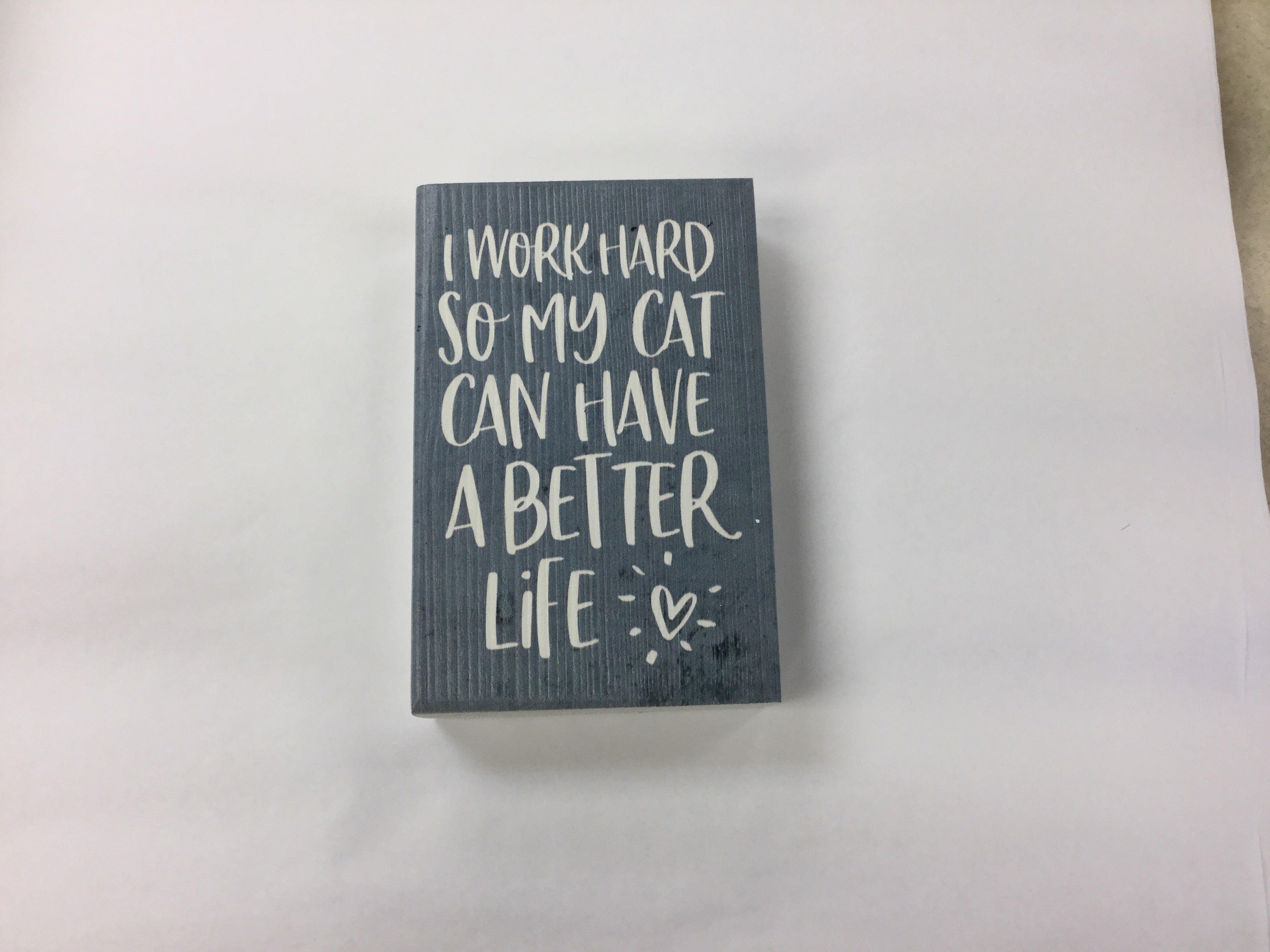 SINCERE SURROUNDINGS WOODEN SAYING BLOCK - I WORK HARD SO MY CAT CAN HAVE A BETTER LIFE