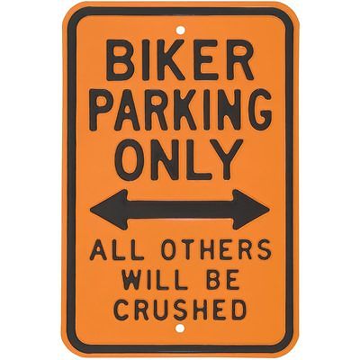 Biker Parking Only Metal Sign Ande Rooney Embossed Steel Sign Collection utilizes the same die stamp process used in the making of traditional street and road signs across America.The background is a powder coat applied enamel. The embossed letters are roll printed with a contrasting color enamel. The result is a reproduction novelty street sign that is long lasting and maintains the quality that has made Ande Rooney Signs a hosehold name. Ande Rooney Embossed Steel Signs are crafted with pride in the USA.