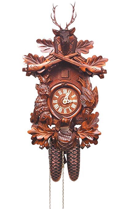 Black Forest cuckoo clock made in Germany - 8-day weight driven movement- cuckoos and gongs once on each half hour and number of hours on the hour - Deer head with antler design in walnut finish.