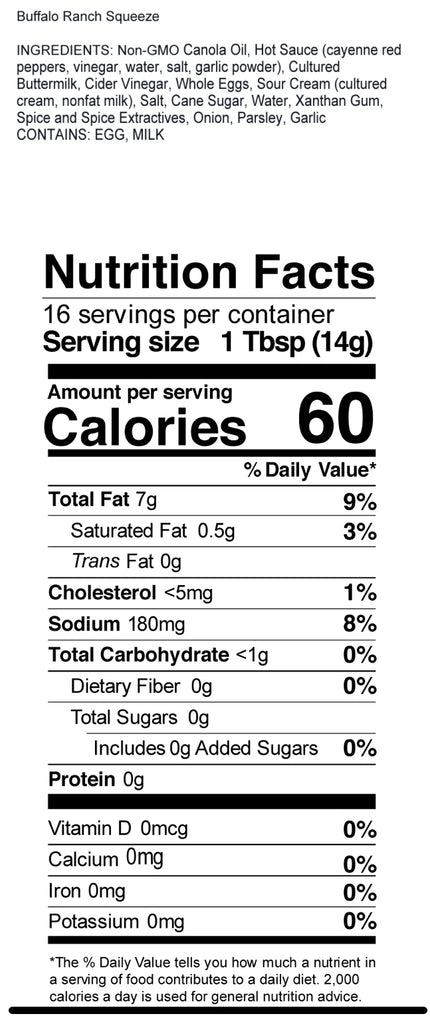 Cool, tangy buttermilk ranch and zesty, spicy buffalo sauce combine to make a well balanced taste sensation! Delicious on wraps, chicken sandwiches or burgers. Great dipping sauce for fried shrimp, chicken tenders or onion rings.