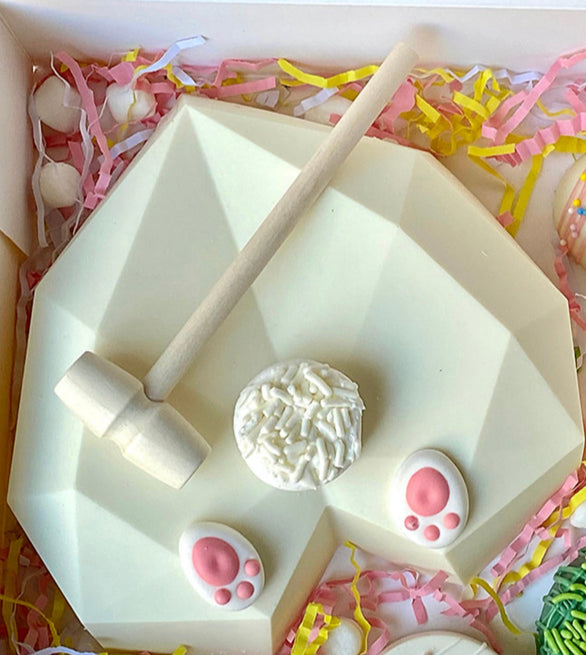 Chocolate BUNNY BUTTS are basically a chocolate case shaped in the form of an adorable bunny butt, that is hollow and can be lifted up to be filled in with candies, cakes, chocolates, non edible gifts just about anything. This is then smashed using a hammer to reveal the surprise inside just like a regular pinata cake. It is super fun to smash apart to reveal the hidden treasures. Bunny Butts are individually done, not all will be exactly like the pictured.