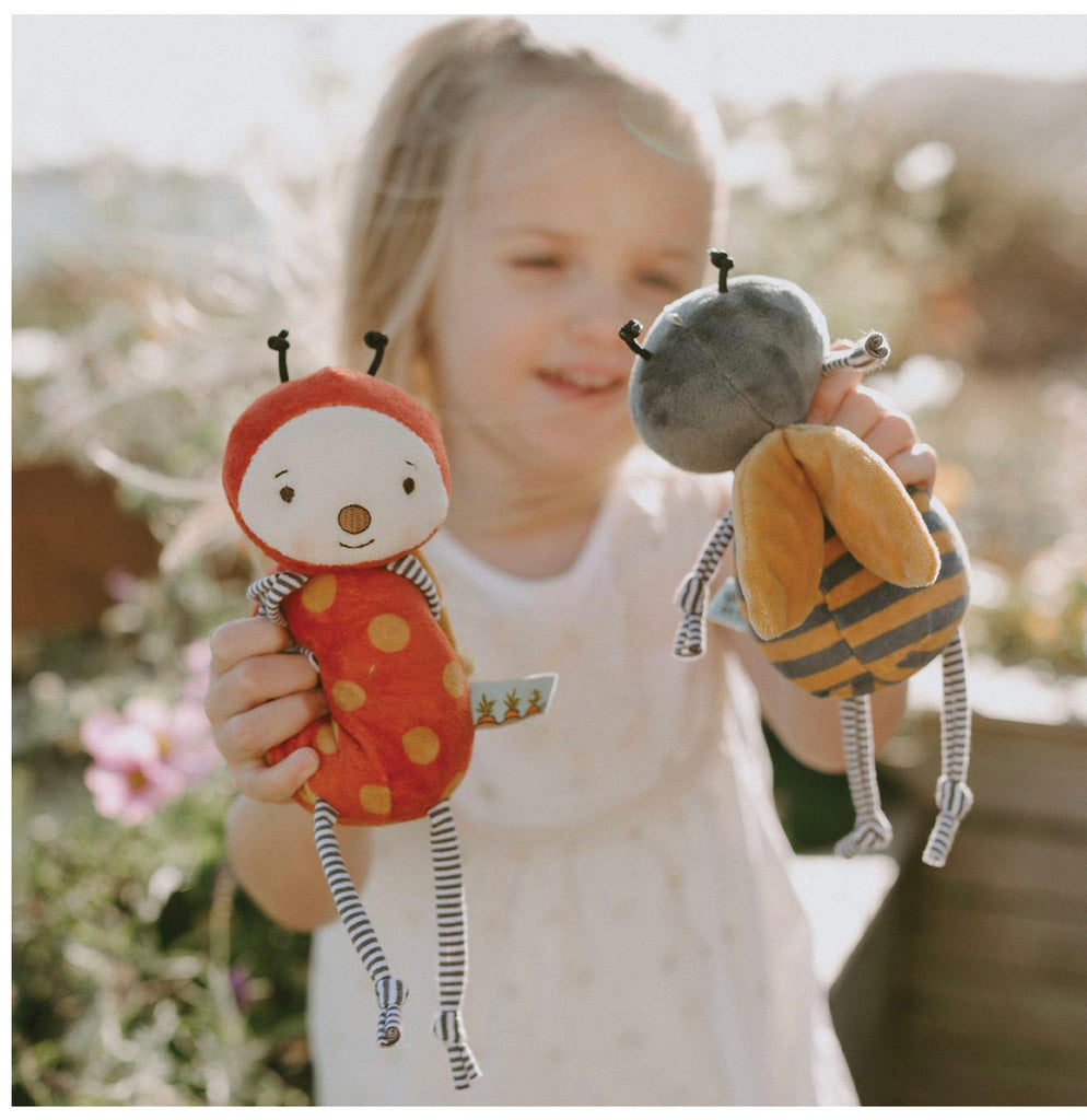 Soft red and orange velour, with knit dangly arms, legs, and antenna, and a velcro loop for attaching to strollers and car seats this little bug is sure to become a treasured toy for your little one.