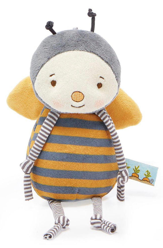 Soft gray and orange velour, with knit dangly arms, legs, and antenna, and a velcro loop for attaching to strollers and car seats this little bug is sure to become a treasured toy for your little one.