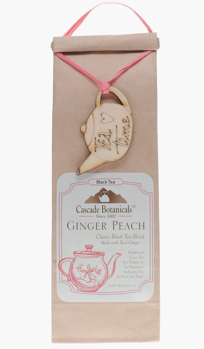 GINGER PEACH BLACK TEA Ingredients: Black Tea Leaves, Natural Peach Flavor, Powdered Ginger. Traditional Loose Tea For Teapots or Tea Strainers. Popular tea flavors, in loose leaf packaging, highlighted by unique charms hanging on colorful raffia on the outside of the packages. The charms are embellished with sentiments that are heartwarming and inspirational.