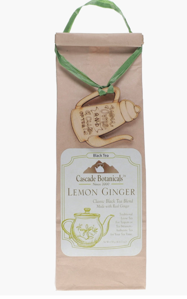 LEMON GINGER BLACK TEA Ingredients: Black Tea Leaves, Natural LemonFlavor, Powdered Ginger. Traditional Loose Tea For Teapots or Tea Strainers. Popular tea flavors, in loose leaf packaging, highlighted by unique charms hanging on colorful raffia on the outside of the packages. The charms are embellished with sentiments that are heartwarming and inspirational.