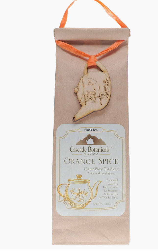 ORANGE SPICE TEA Ingredients: Black Tea Leaves, Natural Orange Flavor, Powdered Ginger, Cinnamon & Cloves. Traditional Loose Tea For Teapots or Tea Strainers. Popular tea flavors, in loose leaf packaging, highlighted by unique charms hanging on colorful raffia on the outside of the packages. The charms are embellished with sentiments that are heartwarming and inspirational.