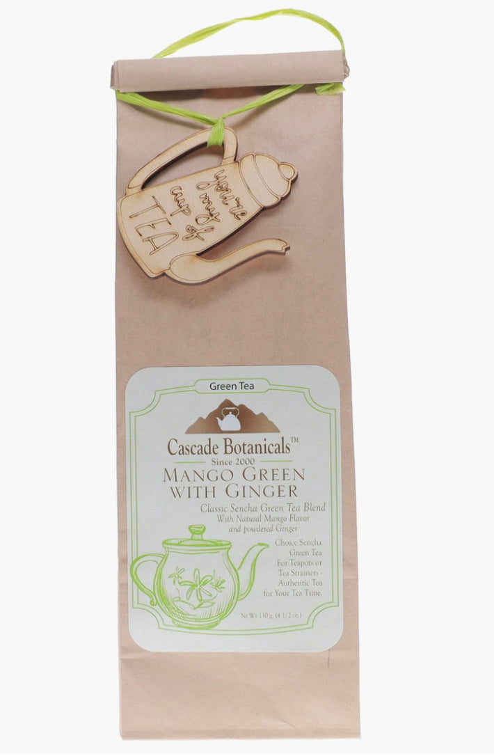 MANGO GREEN TEA WITH GINGER Ingredients: Sencha Green Tea Leaves, Natural Mango Flavor, and powdered Ginger. Traditional Loose Tea For Teapots or Tea Strainers. Popular tea flavors, in loose leaf packaging, highlighted by unique charms hanging on colorful raffia on the outside of the packages. The charms are embellished with sentiments that are heartwarming and inspirational.