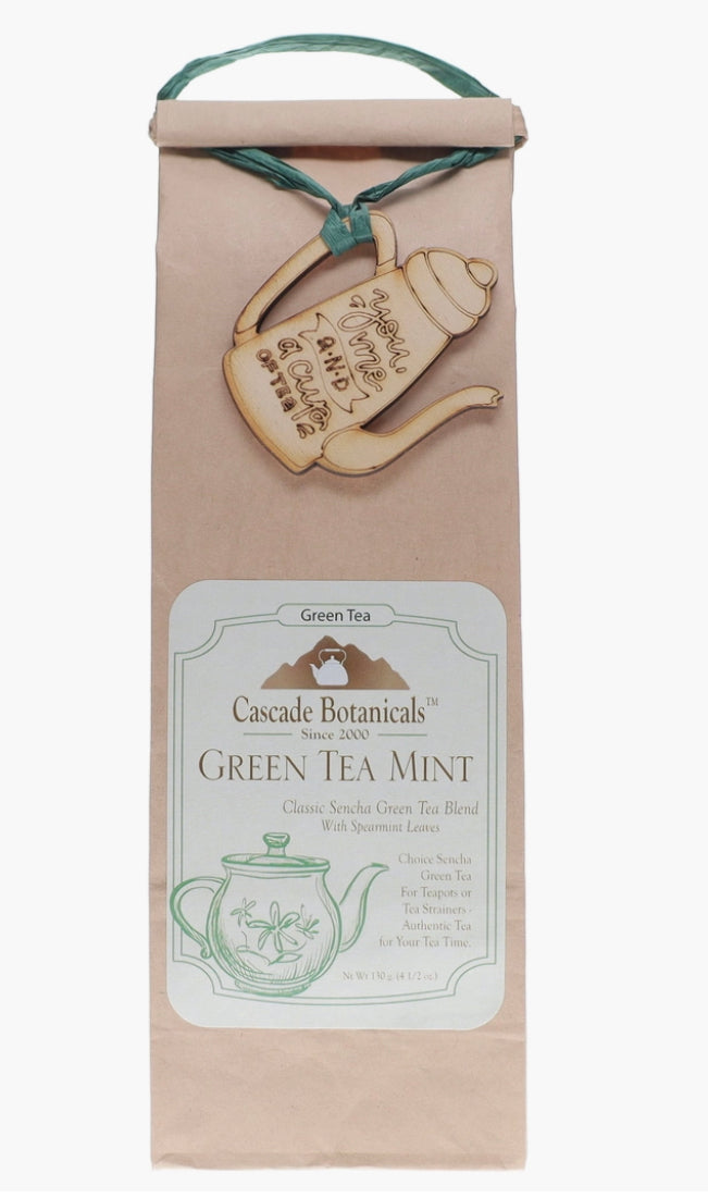 GREEN TEA MINT Ingredients: Sencha Green Tea Leaves, Spearmint Leaves, Natural Mint Flavor. Traditional Loose Tea For Teapots or Tea Strainers. Popular tea flavors, in loose leaf packaging, highlighted by unique charms hanging on colorful raffia on the outside of the packages. The charms are embellished with sentiments that are heartwarming and inspirational.