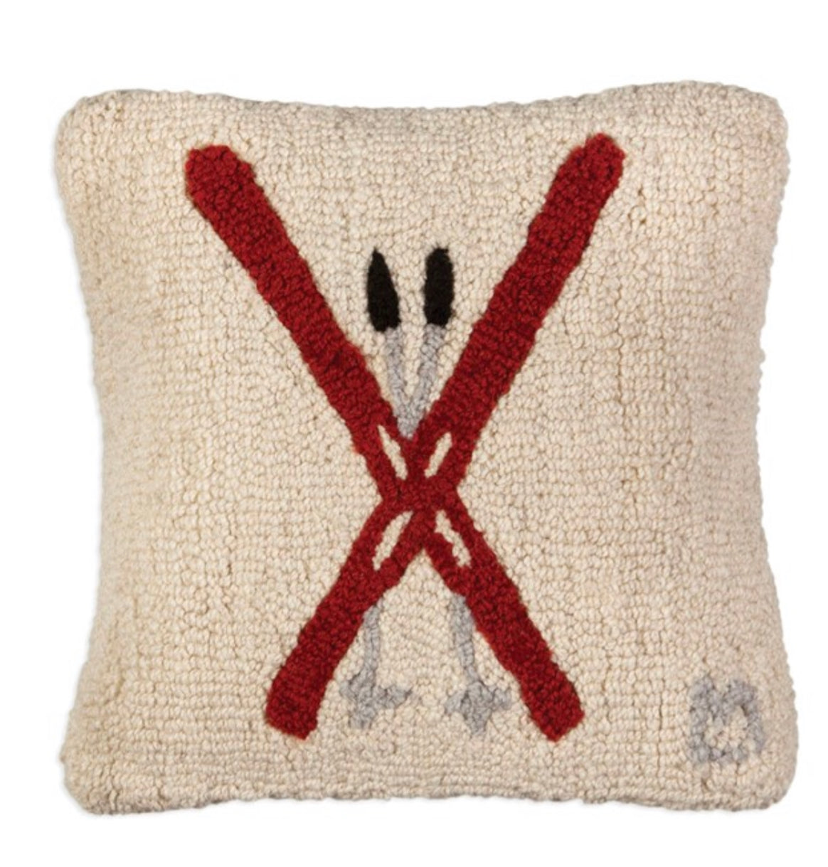 Nothing says winter like a great day out on the slopes and what better way to celebrate winter than with this hooked wool pillow depicting crossed red skis in the snow. The perfect accent or the ski home in the mountains.