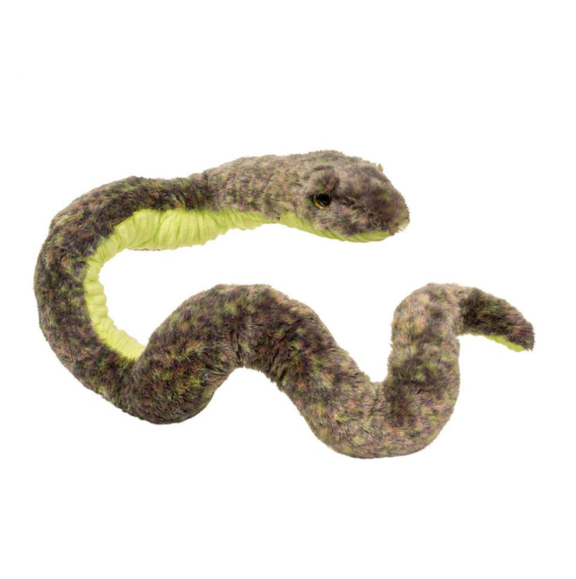 Slither through the exotic jungle foliage with Cyril the Snake stuffed animal! With his soft, mottled plush coat of grays, greens, and browns, he blends right in with the shadows and the shrubs! His long, lithe body is perfectly designed to wend its way along the rainforest floor or around the back of your shoulders. Cyril’s ridged underbelly is velvety and soft and features a bright spring green while resilient polyester fill ensures this engaging plush snake will hold up to hours of play. His eyes glitter gold with a cunning, lifelike expression that will leave you mesmerized. Make Cyril the plush Snake yours today and he will share with you the secrets of his tangled jungle habitat!