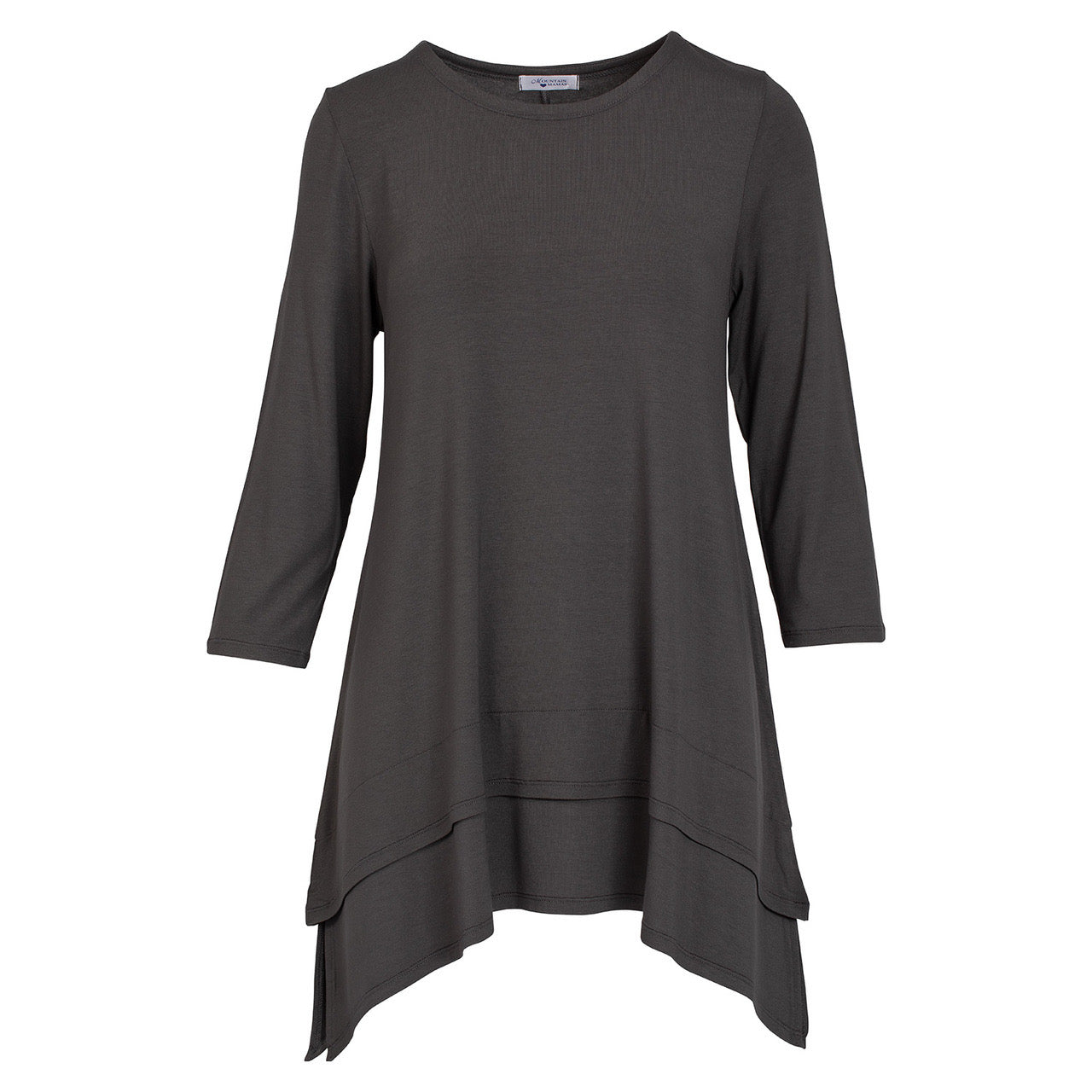 This versatile tunic is soft and fluid with a lovely double waterfall hemline that dresses up or down with ease. This asymmetrical design of this top creates a nice vertical line and a longer, flattering silhouette. The tunic features ¾ length sleeves and great colors! This one comes in a rich sapphire blue.