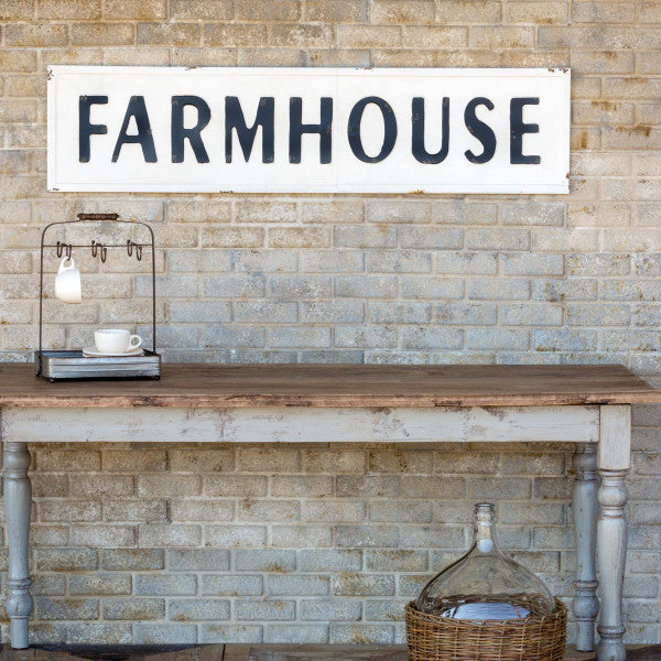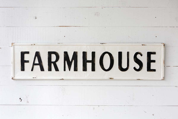 Spell out the meaning of farmhouse style with this embossed metal farmhouse sign. Hang indoors or out to add rustic charm.