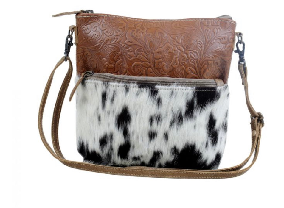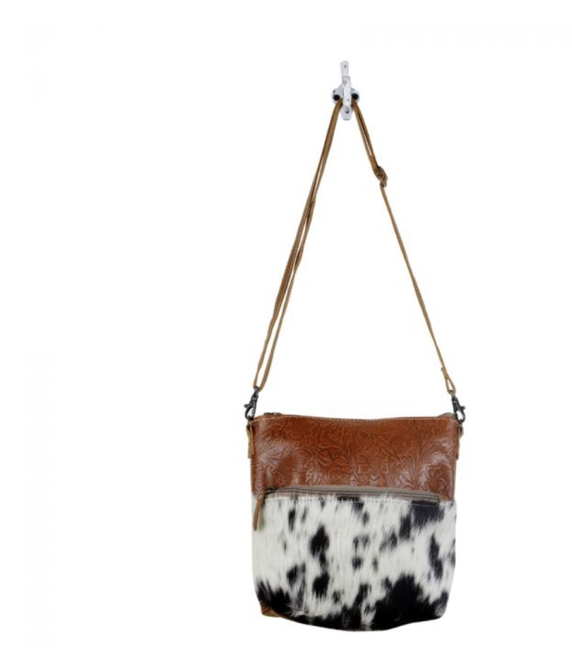 Dress to impress with this crossbody bag which has an exceptional fusion of faux cowhide and embossed leather. It has perfectly placed internal compartments to keep your essentials close at hand.