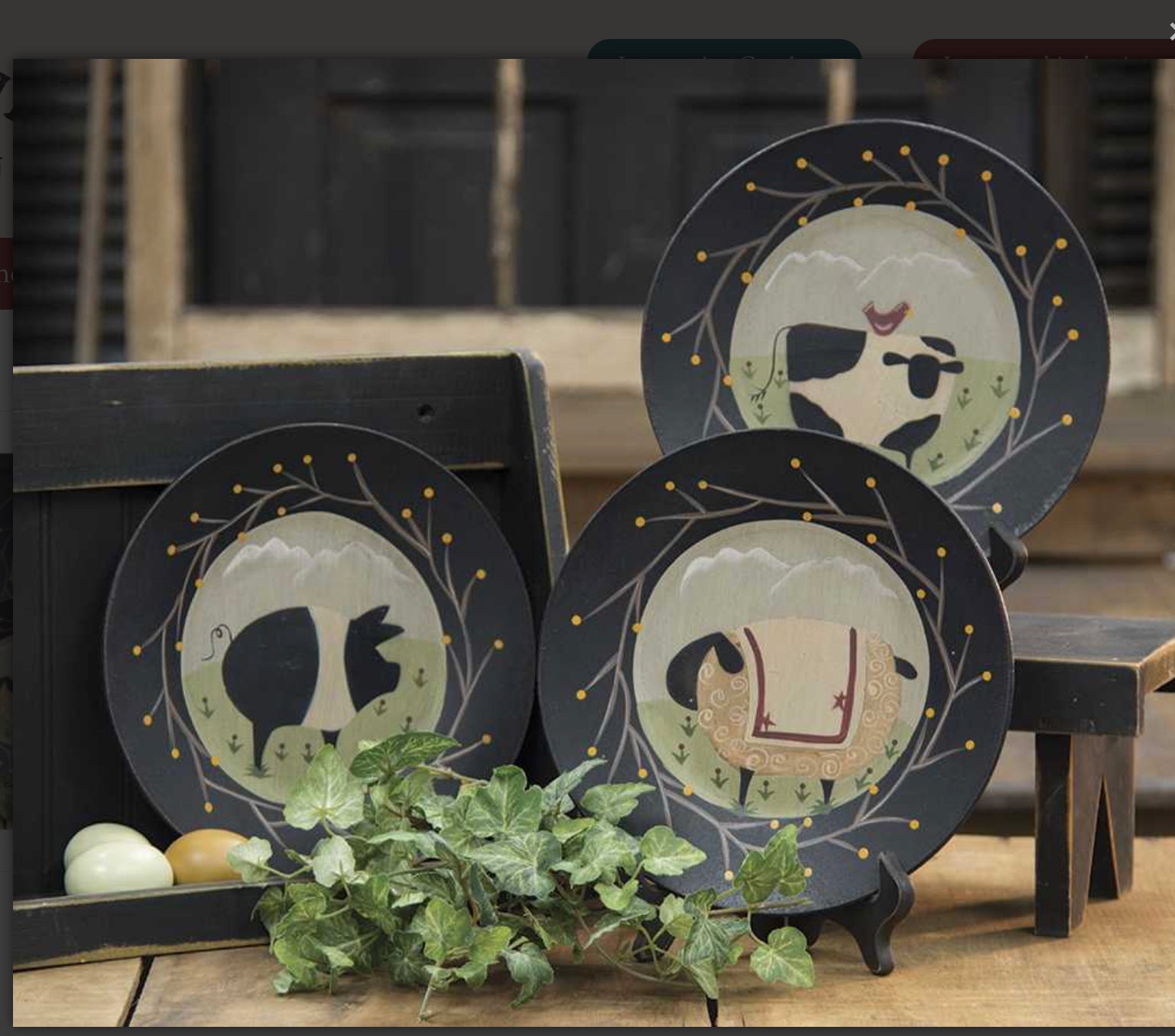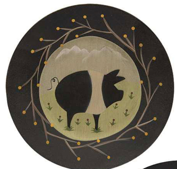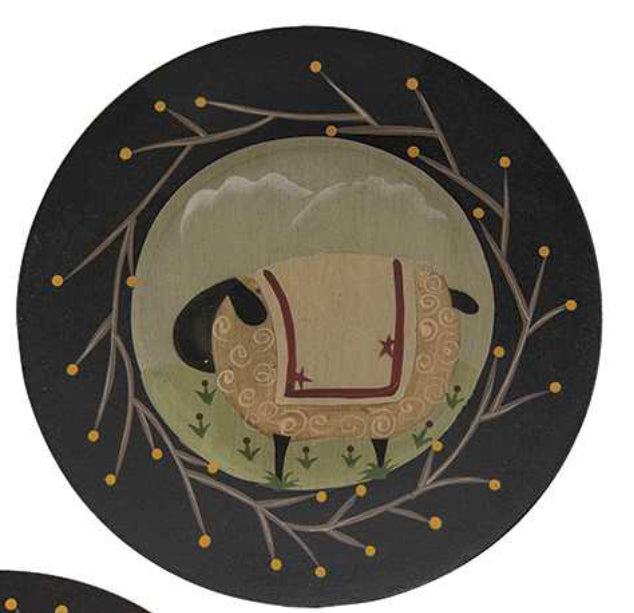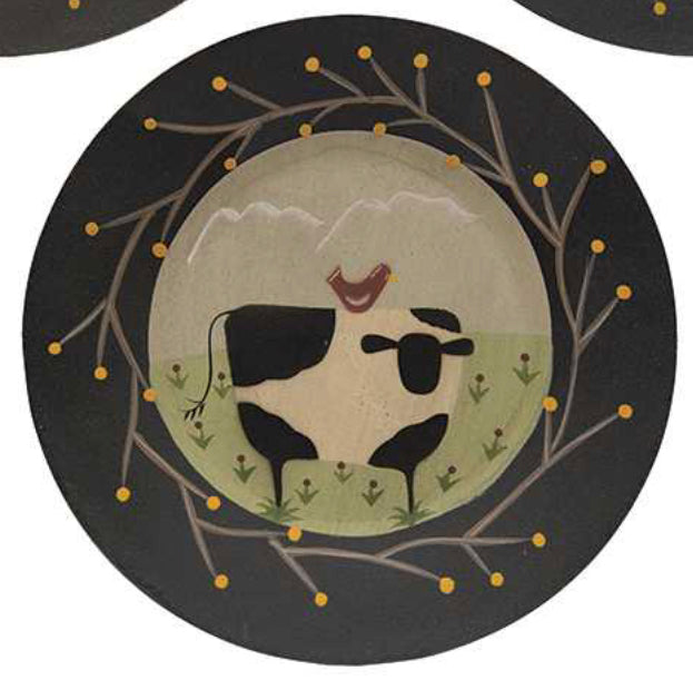 Our Farmyard Friends Plate is an assortment of 3 wooden plates measuring 9-1/2" in diameter. Each plates features a black border decorated with hand painted pip berry vines while the center of the plate features primitive style farm animals in a country setting.