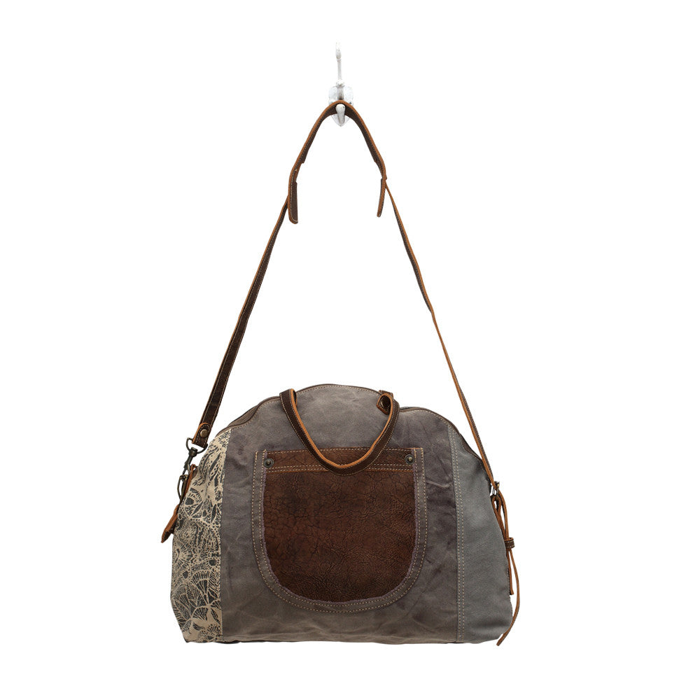 This circular bag comes with floral prints and a big front pocket made up of genuine leather featuring detachable leather strap.