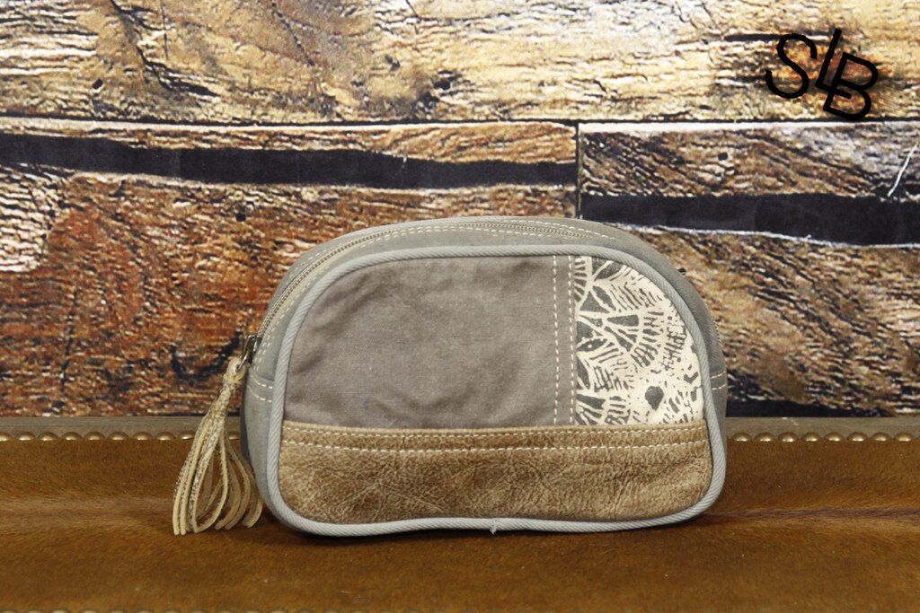 Myra Bag upcycled canvas toiletry bag with cloth lined interior, leather accent and zip closure perfect for travel.