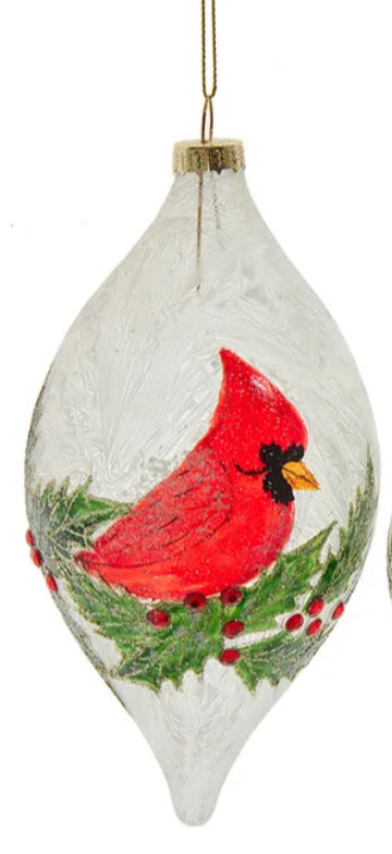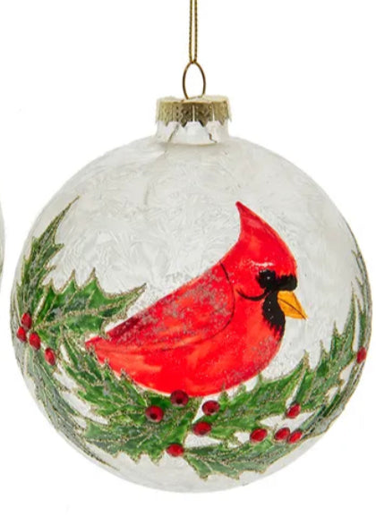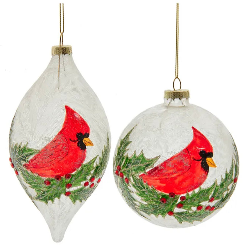 These glass ball and finial ornaments from Kurt Adler are a festive addition to any holiday décor or Christmas tree. Included in this assortment are a white glass ball and finial ornament, each ornament is decorated with a glittered cardinal and holly leaf design with red gemstone berries.