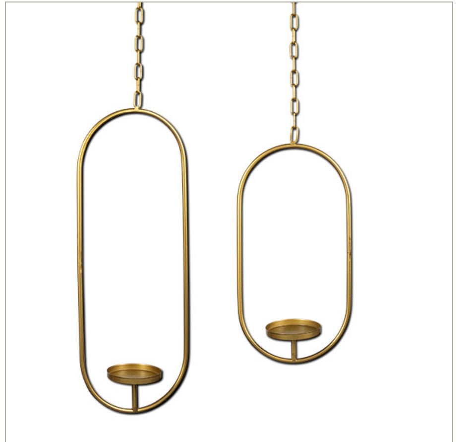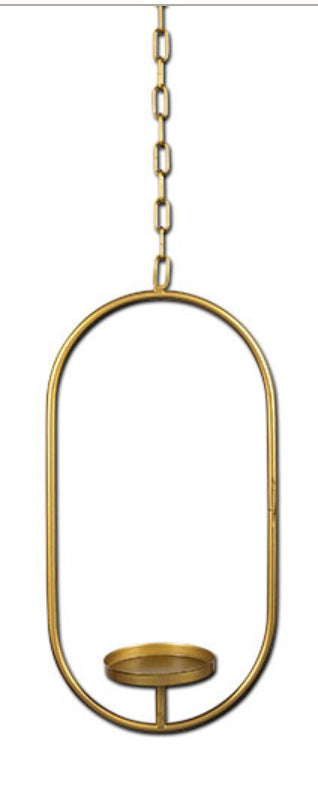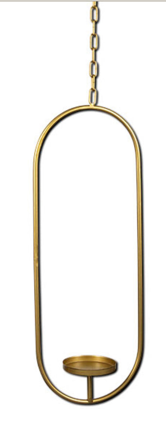 Gold Oval Hanging Metal Candle Holders. Large: 7.28InL x 3.54InW x 20.87InH (UPC: 037916452296) Length with Chain 43.5"H,