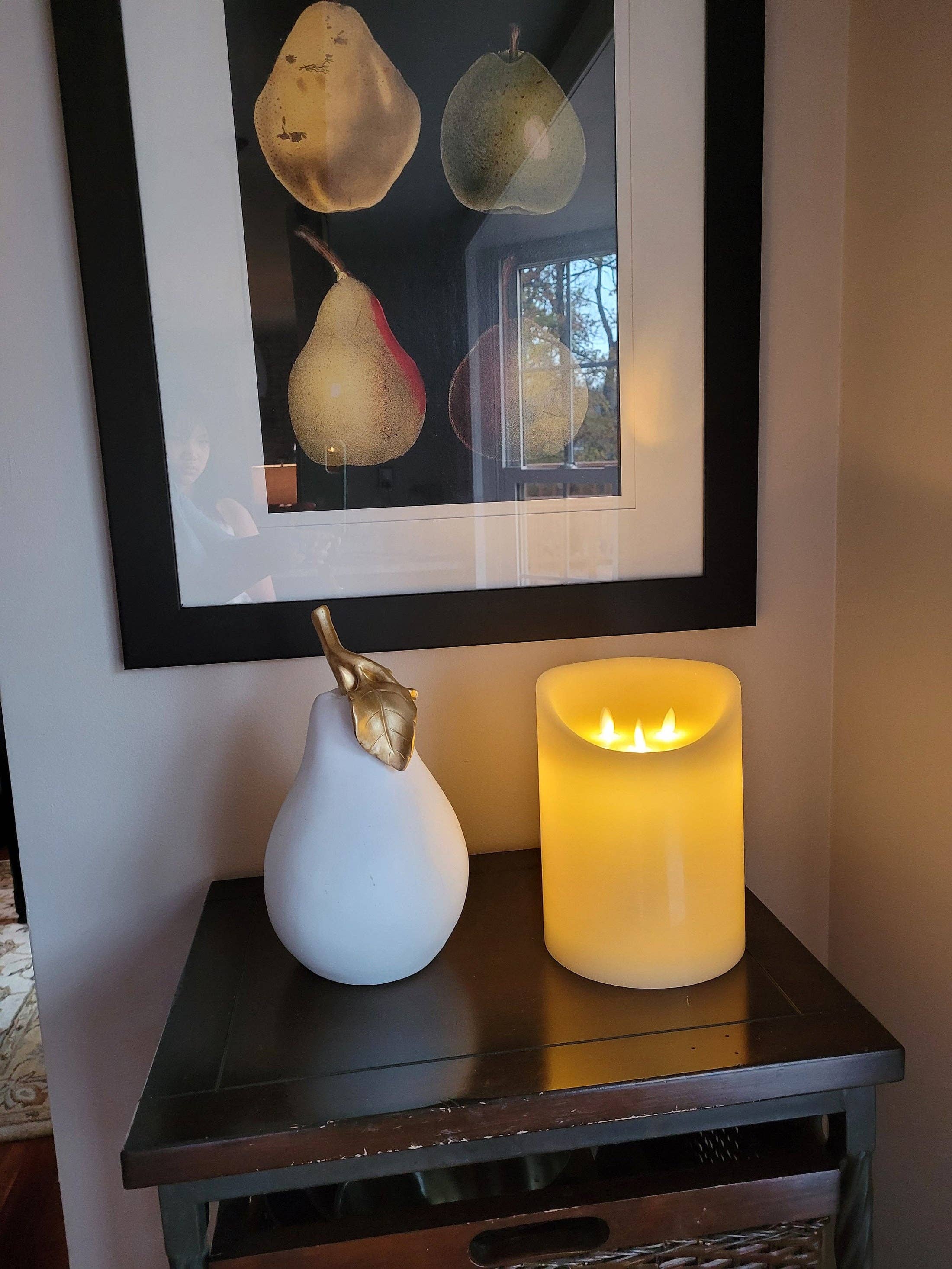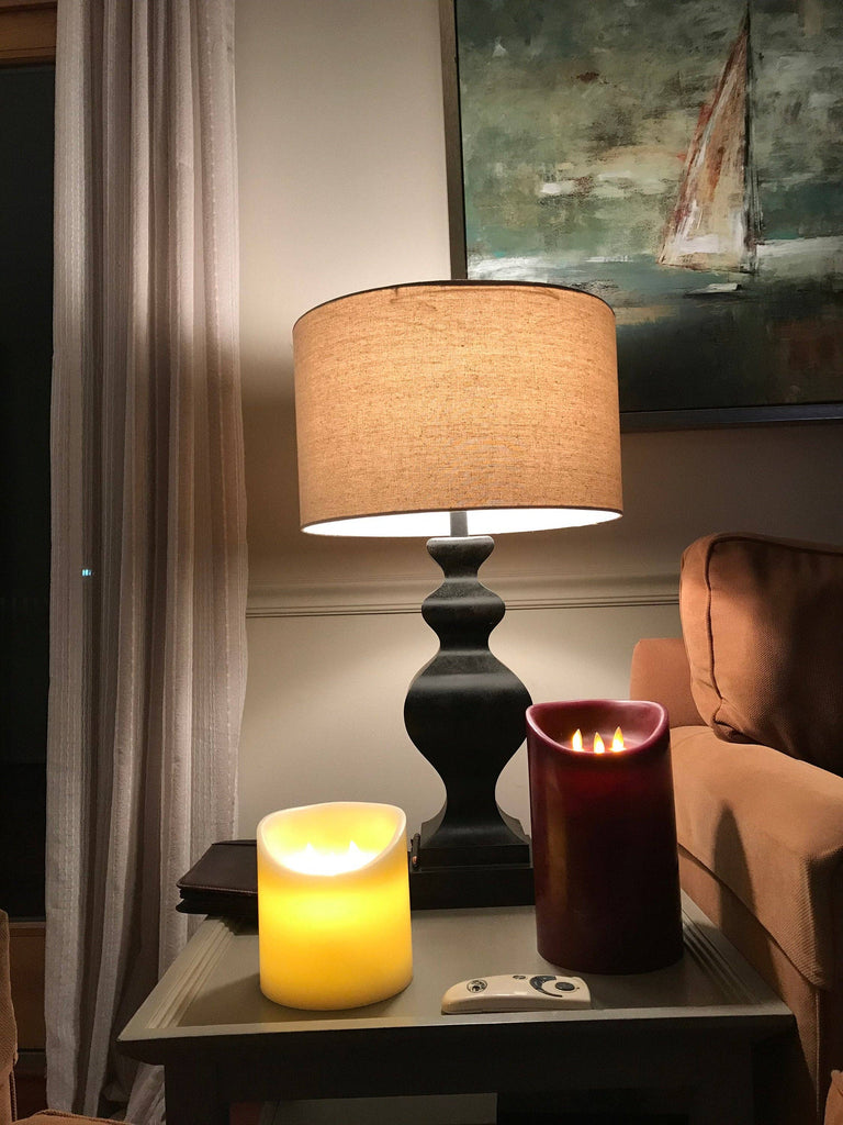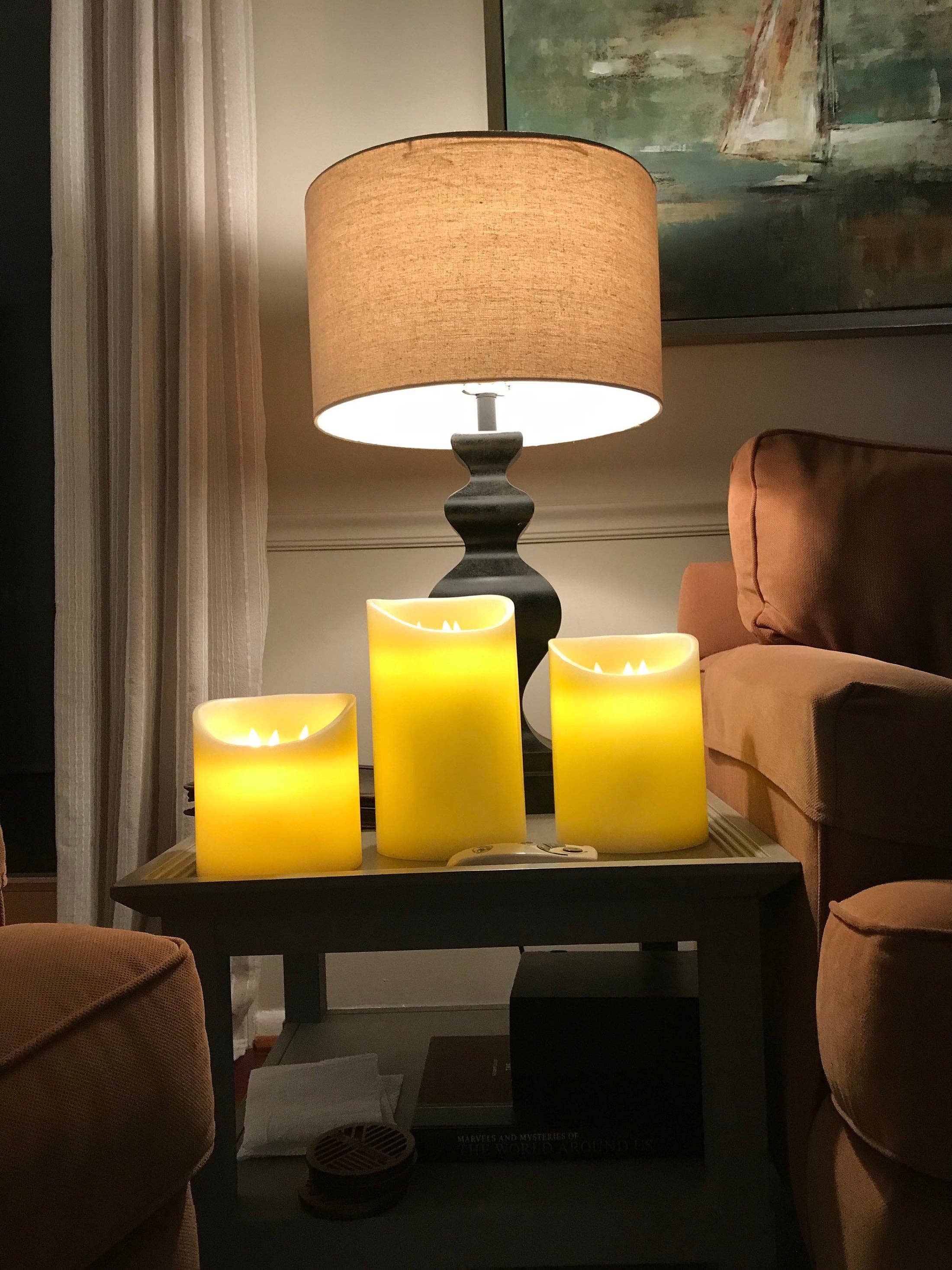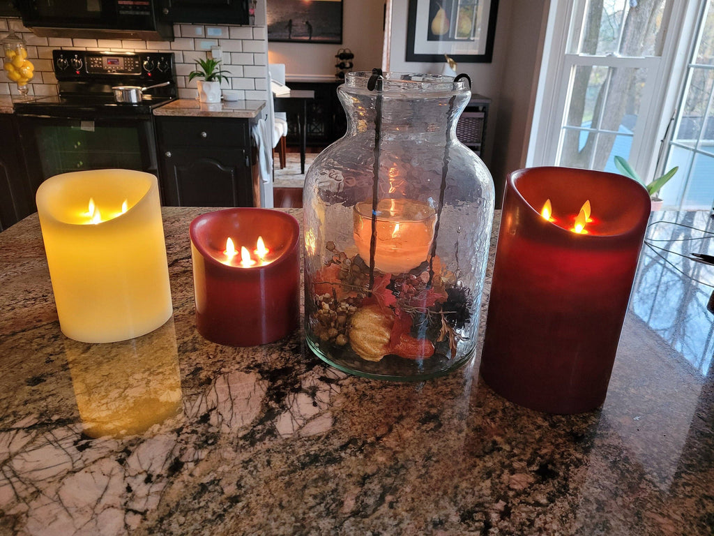 Our LED candles with 3 flickering wicks come in two colors and three sizes: small 6"x6", medium 6"x 8’’, large 6"x10’’ All candles: Run on 3 AA batteries Come with 3 switch options: on, off, and a 6 hr timer