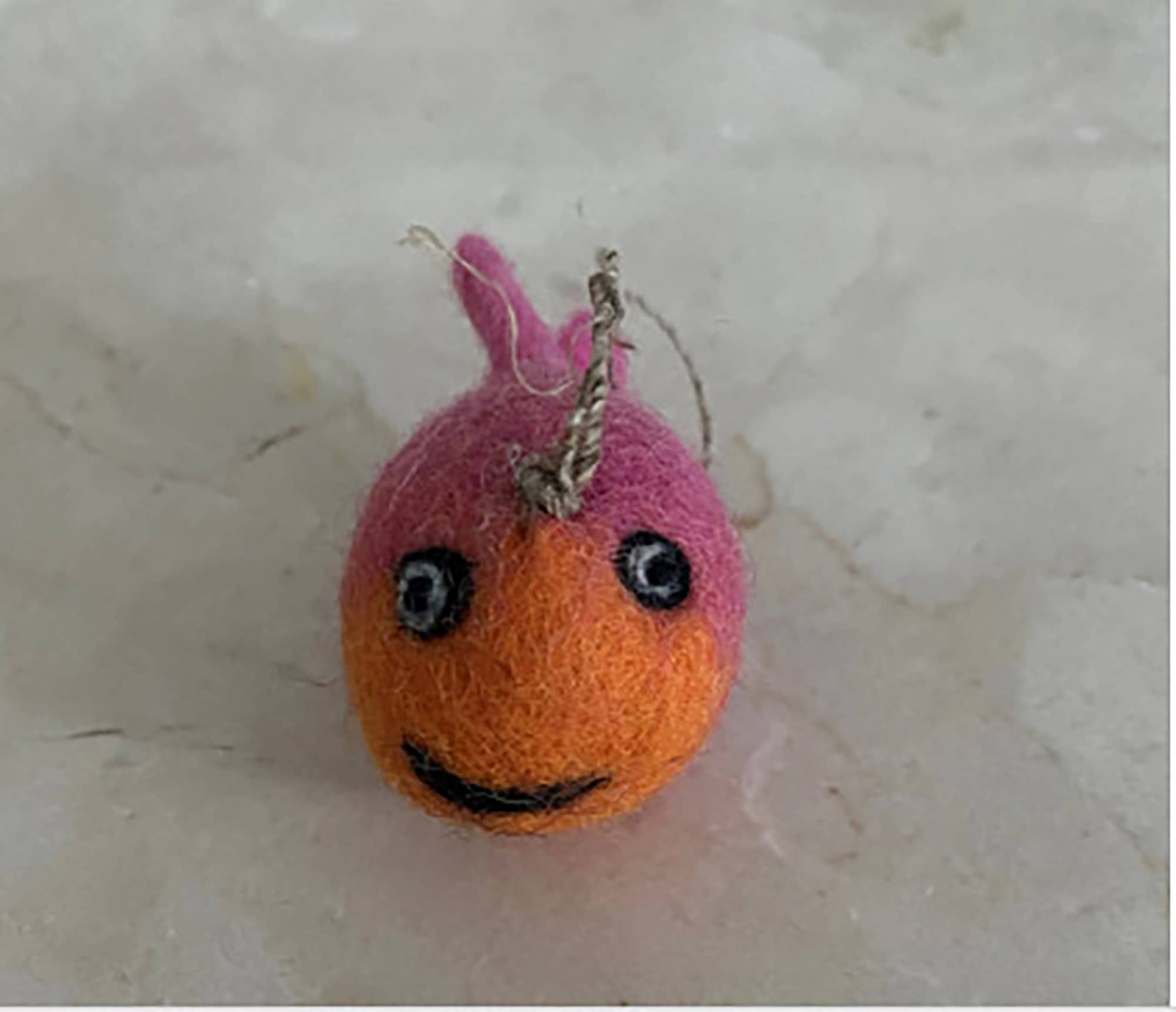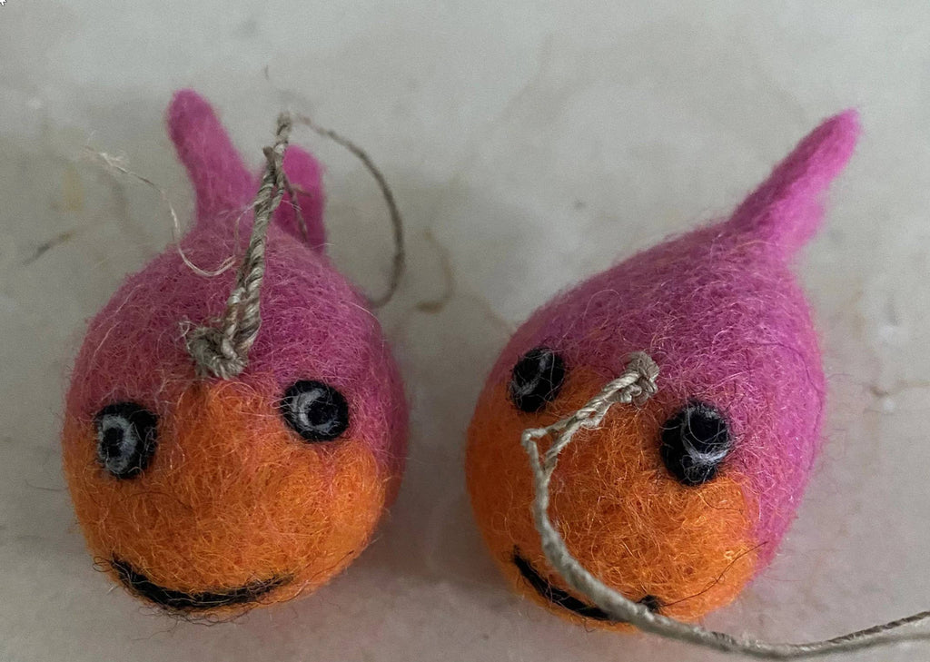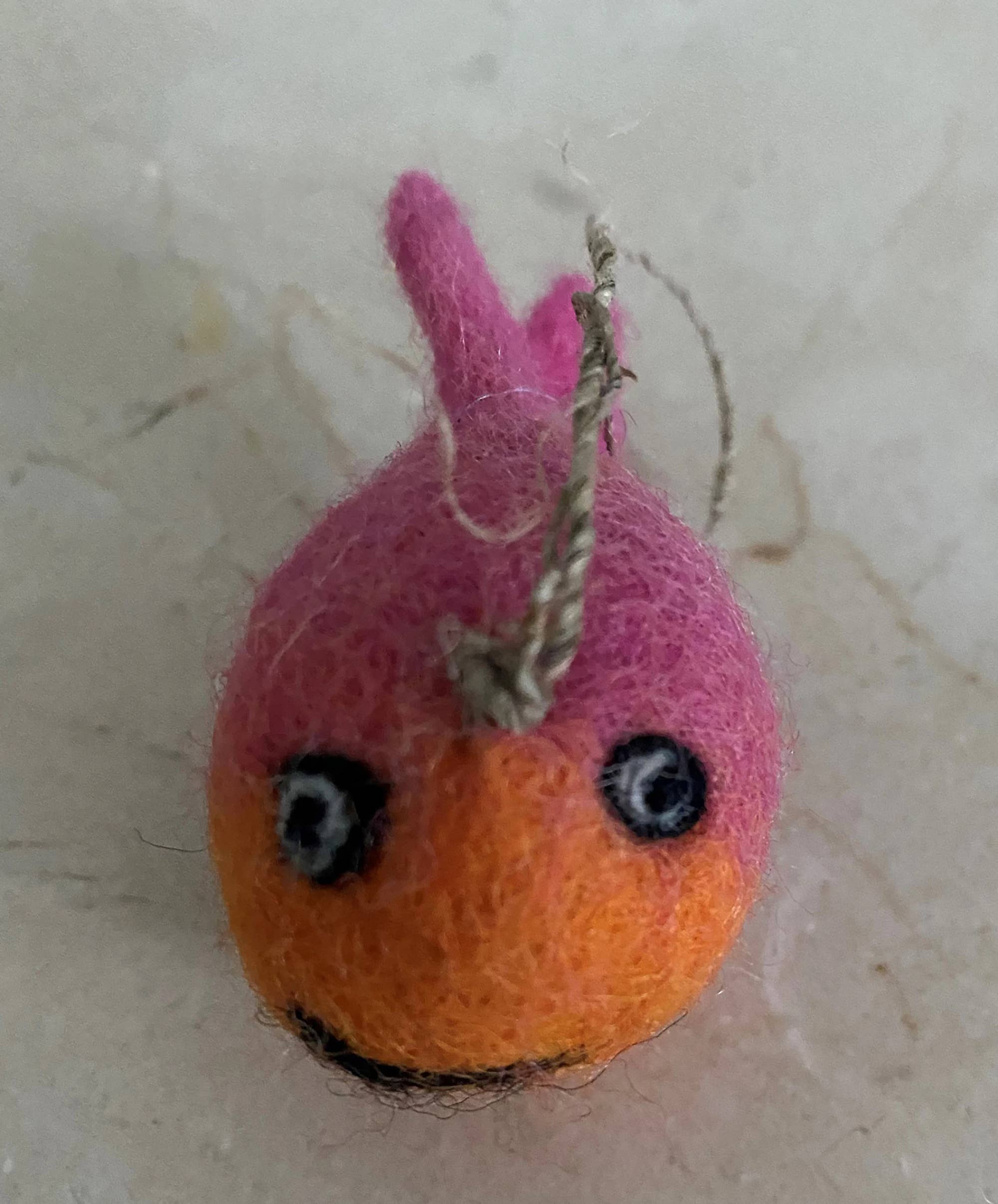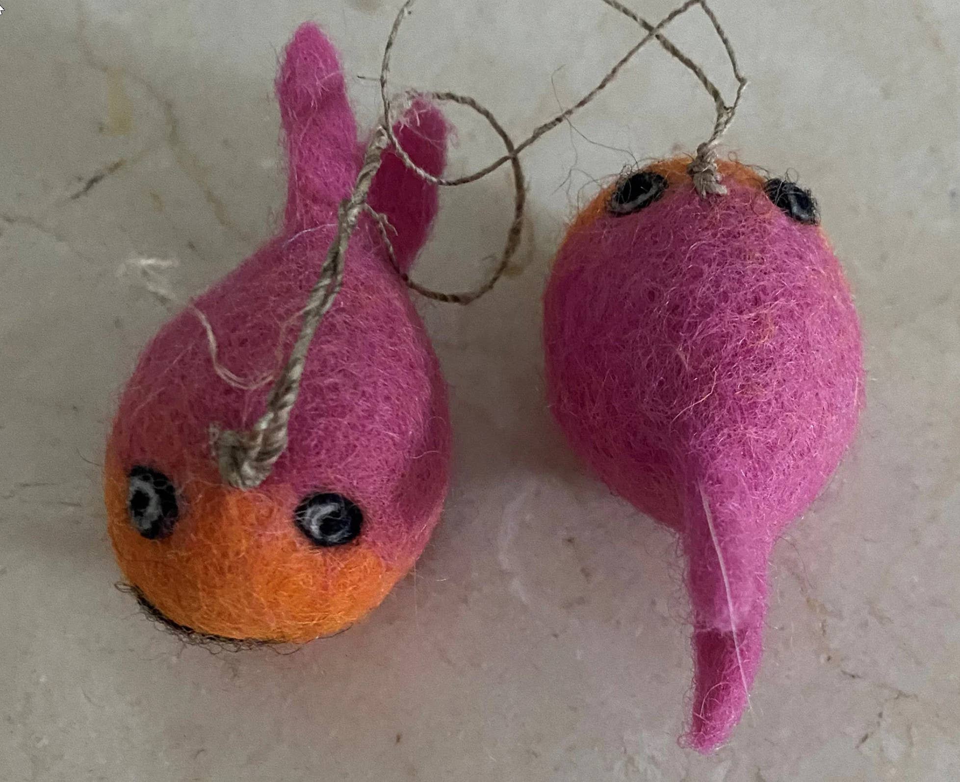 Felted wool "Pink Whitney" Fish ornament Pink Whitney is affectionately known to all as P.W. P.W. measures approximately 1 1/2" x 2" x 1 1/4". Each ornament is lovingly handmade and handstitched and ethically produced providing fair wages and safe working conditions. Ornaments are made using 100% New Zealand wool. Share the love this holiday season!