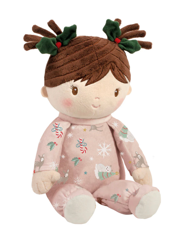 Make Baby’s first holiday season even more special with Holli the huggable Plumpie Doll! This sweet faced companion is decked out in cozy pajamas that feature decorated trees, snowflakes, candy canes, and adorable forest animals. Holli’s festive hair-do has been embellished with sprigs of holly. Embroidered facial details ensure this plush Doll is safe for infants. Her endearing expression and rosy airbrushed cheeks will win the favor of babies and parents alike! Share the magic of the season with your little one, bring home Holli the soft Plumpie Doll