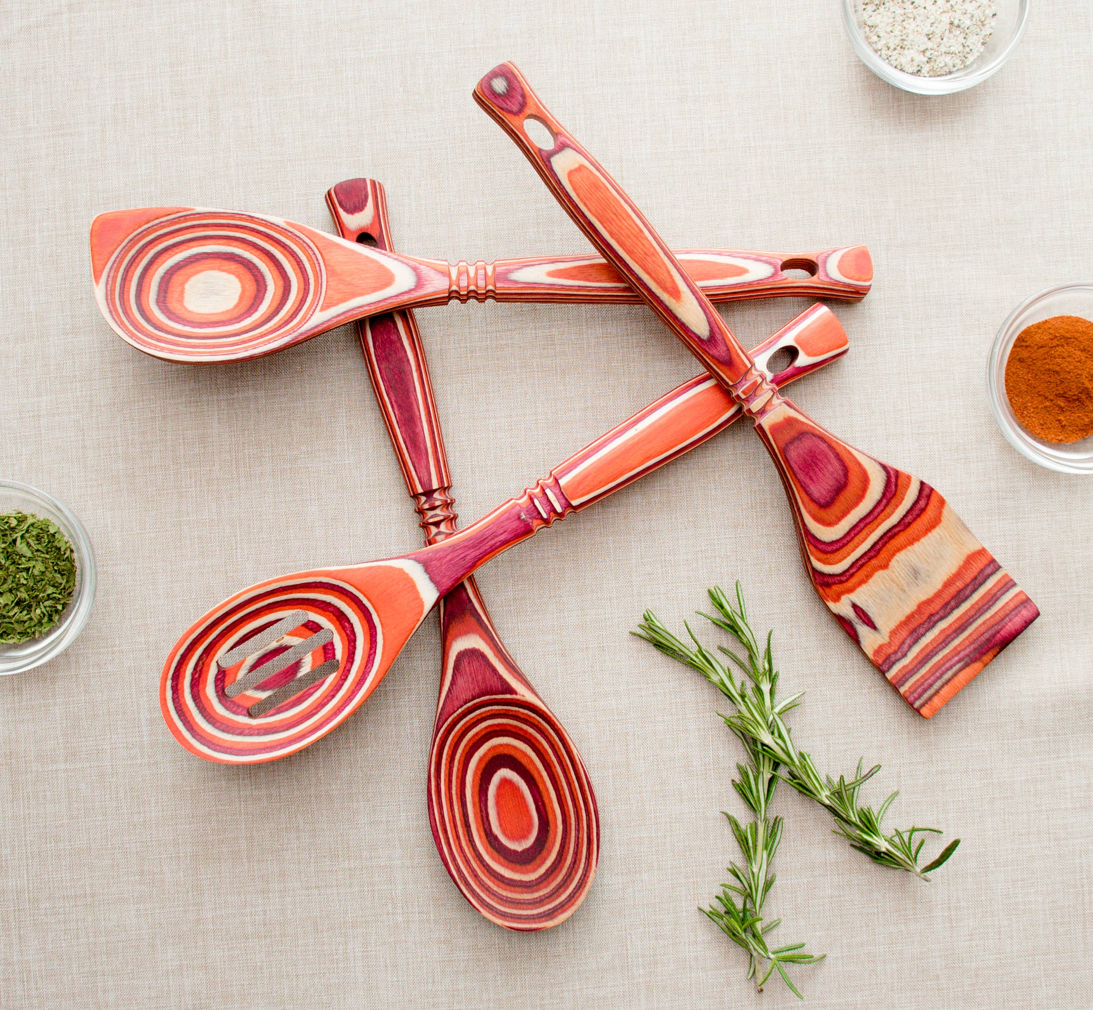 These wood utensils are made with 100% pakka wood. Layers of food safe, colored material make up these unique wood kitchen tools. Care instruction: hand wash only. Fda approved. Approved for heat up to 450 degrees.