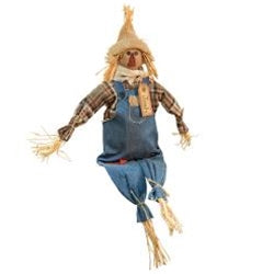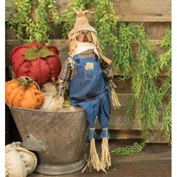 Josh Scarecrow is a primitive scarecrow doll. He wears denim overalls with button accents, a plaid shirt, and a fabric handkerchief tied around his neck. He has raffia hair, and raffia peaks out from around his outfit and the top of his burlap hat. He measures 12" high in a seated position, or 22" high overall.