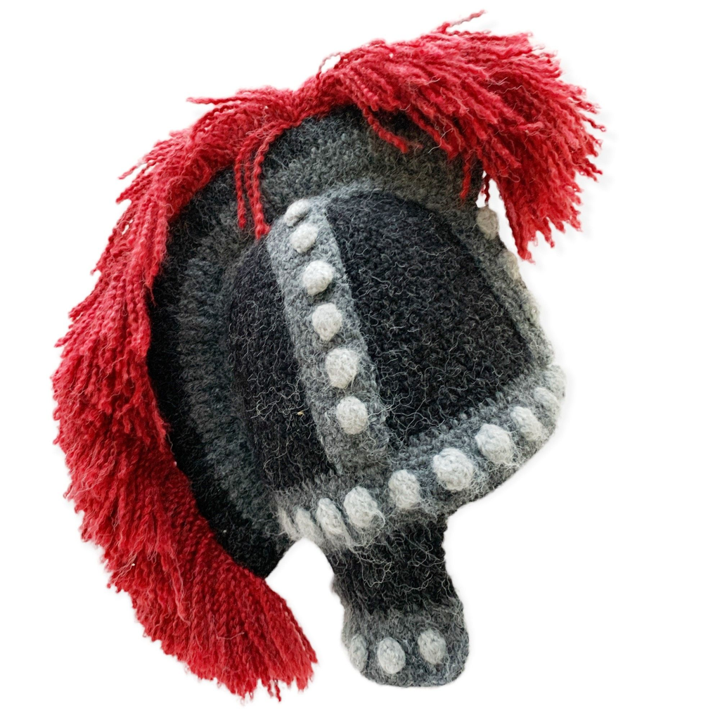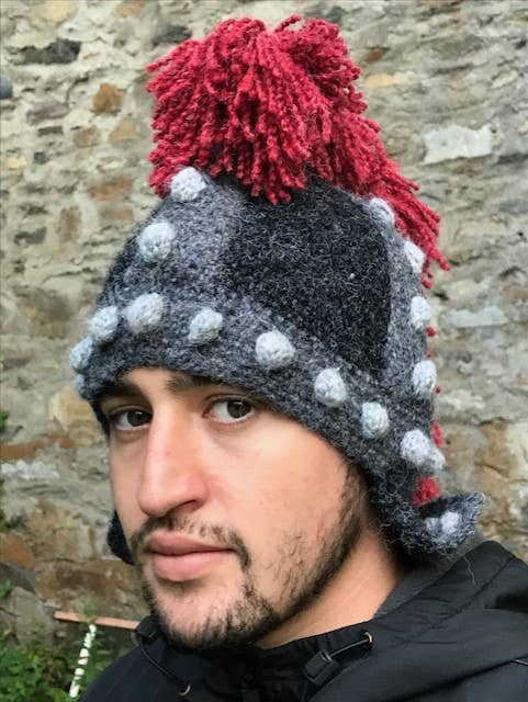 Hand Crochet hat embelliished with 30 yarn balls and a magnificent crest that will transport you to mideval times as a knight. 100% Faux Alpaca Hypoallergenic Acrylic. O/S. SEE LEAD TIME
