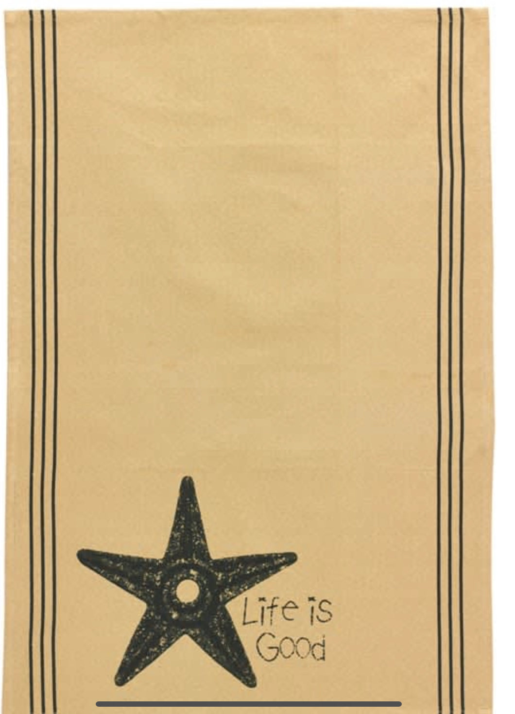 We carry over 400 + styles of decorative dishtowels. Customers order them by the 1/2 dozen. They make great gifts! This Life Is Good industrial style printed dishtowel from Park Designs measures 18" x 28". Customer also sew and make these art print towels into pillows.