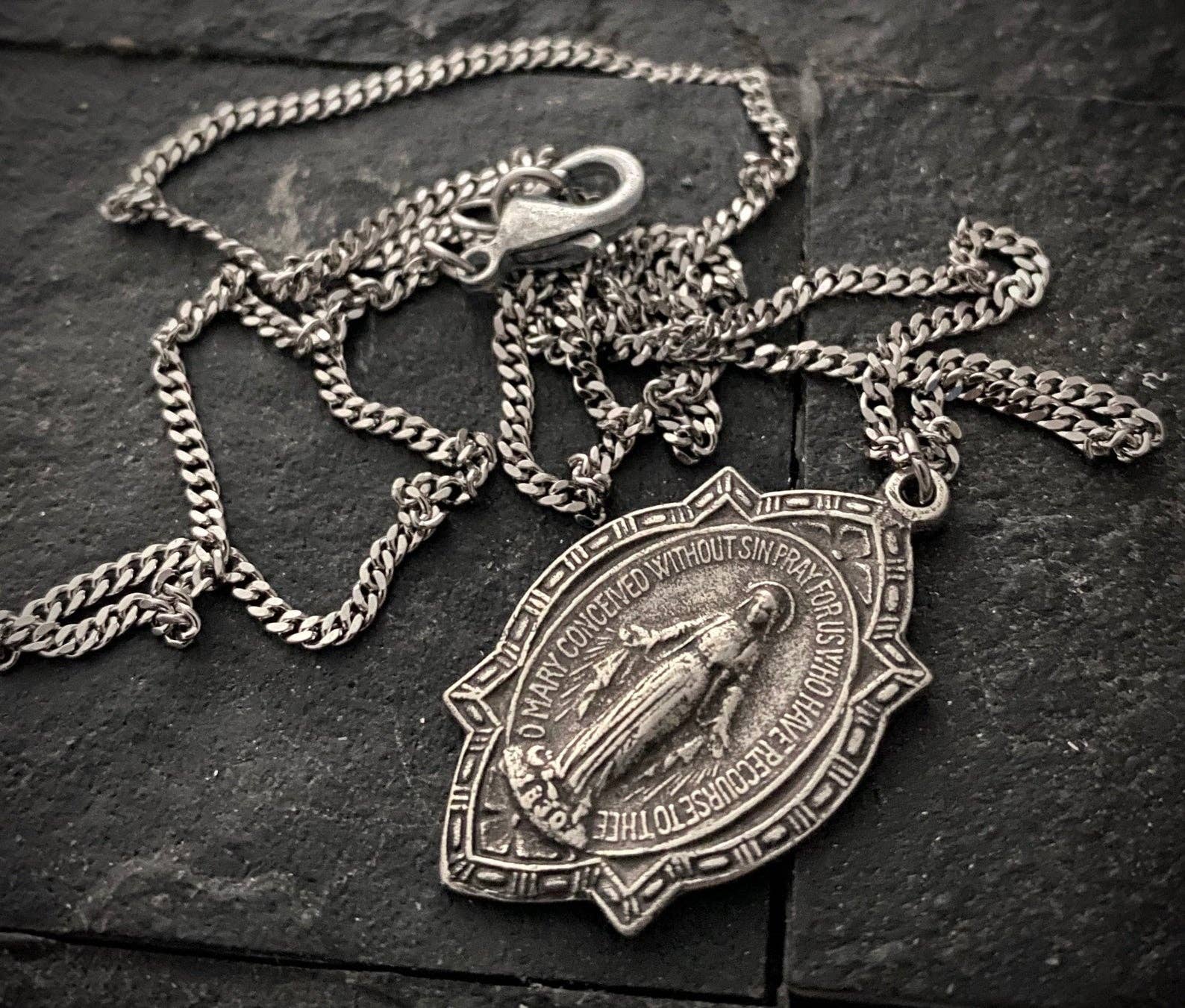 Miraculous Medal Blessed Mother men's Necklace: 24"